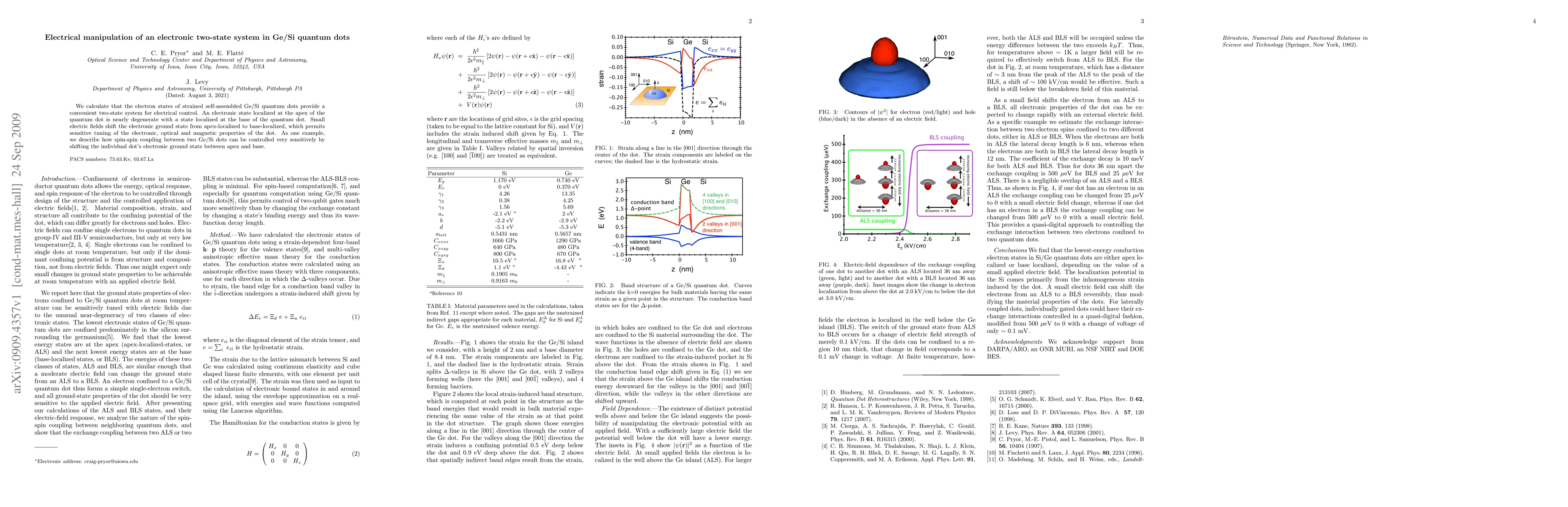We calculate that the electron states of strained self-assembled Ge/Si quantum dots provide a convenient two-state system for electrical control. An electronic state localized at the apex of the quantum dot is nearly degenerate with a state localized at the base of the quantum dot. Small electric fields shift the electronic ground state from apex-localized to base-localized, which permits sensitive tuning of the electronic, optical and magnetic properties of the dot. As one example, we describe how spin-spin coupling between two Ge/Si dots can be controlled very sensitively by shifting the individual dot's electronic ground state between apex and base.