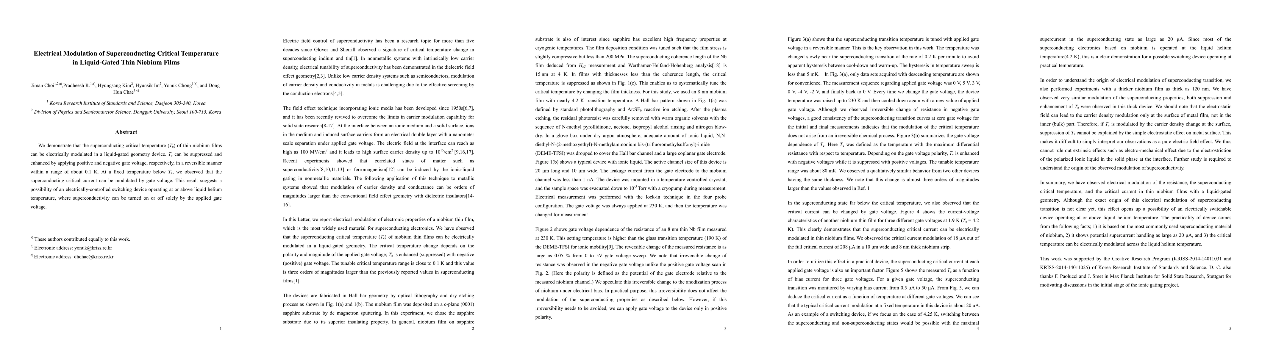 This research demonstrates electrically modulating the superconducting critical temperature (Tc) of thin niobium films using a liquid-gated device, showing reversible suppression and enhancement of Tc by gate voltages. The findings suggest potential for electrically-controlled superconducting switching devices operating at liquid helium temperatures.