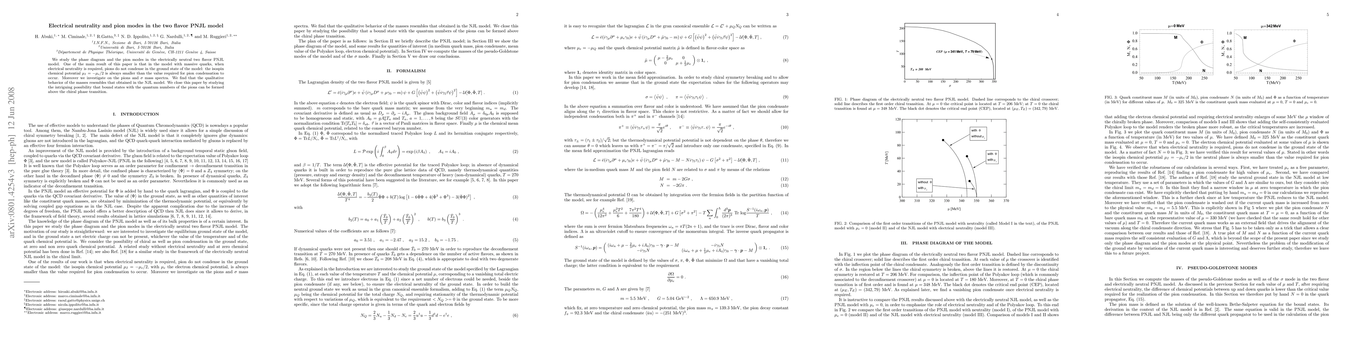 This paper investigates the electrically neutral two flavor PNJL model, finding that pions do not condense in the ground state due to the condition $\mu_I = -\mu_e/2$ preventing pion condensation. It also examines the mass spectra of pions and $\sigma$ mesons, showing similarities to the NJL model, and explores the potential formation of a pion-like bound state above the chiral phase transition.
