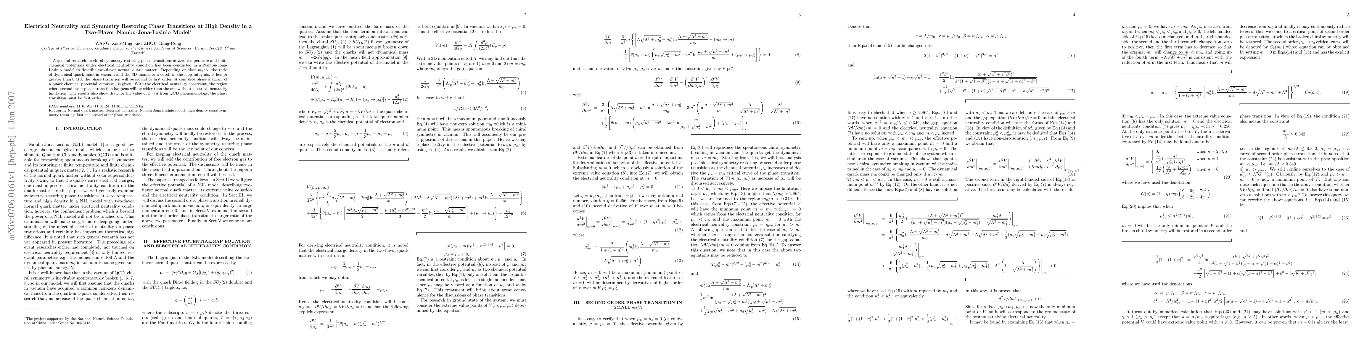 This paper explores chiral symmetry restoration in a two-flavor Nambu-Jona-Lasinio model under electrical neutrality, revealing that the phase transition is second order when $m_0/\Lambda < 0.413$ and first order when $m_0/\Lambda > 0.413$. The study finds that electrical neutrality expands the region of second-order phase transitions.