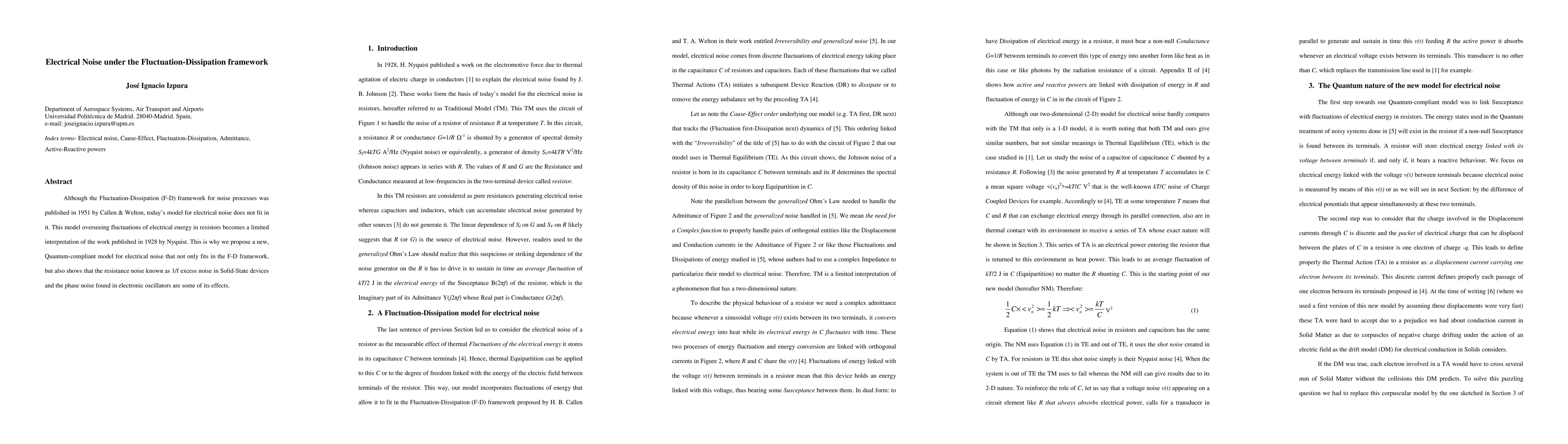 Although the Fluctuation-Dissipation (F-D) framework for noise processes was published in 1951 by Callen and Welton, today's model for electrical noise does not fit in it. This model overseeing fluctuations of electrical energy in resistors becomes a limited interpretation of the work published in 1928 by Nyquist. This is why we propose a new, Quantum-compliant model for electrical noise that not only fits in the F-D framework, but also shows that the resistance noise known as 1/f excess noise in Solid-State devices and the phase noise found in electronic oscillators are some of its effects.