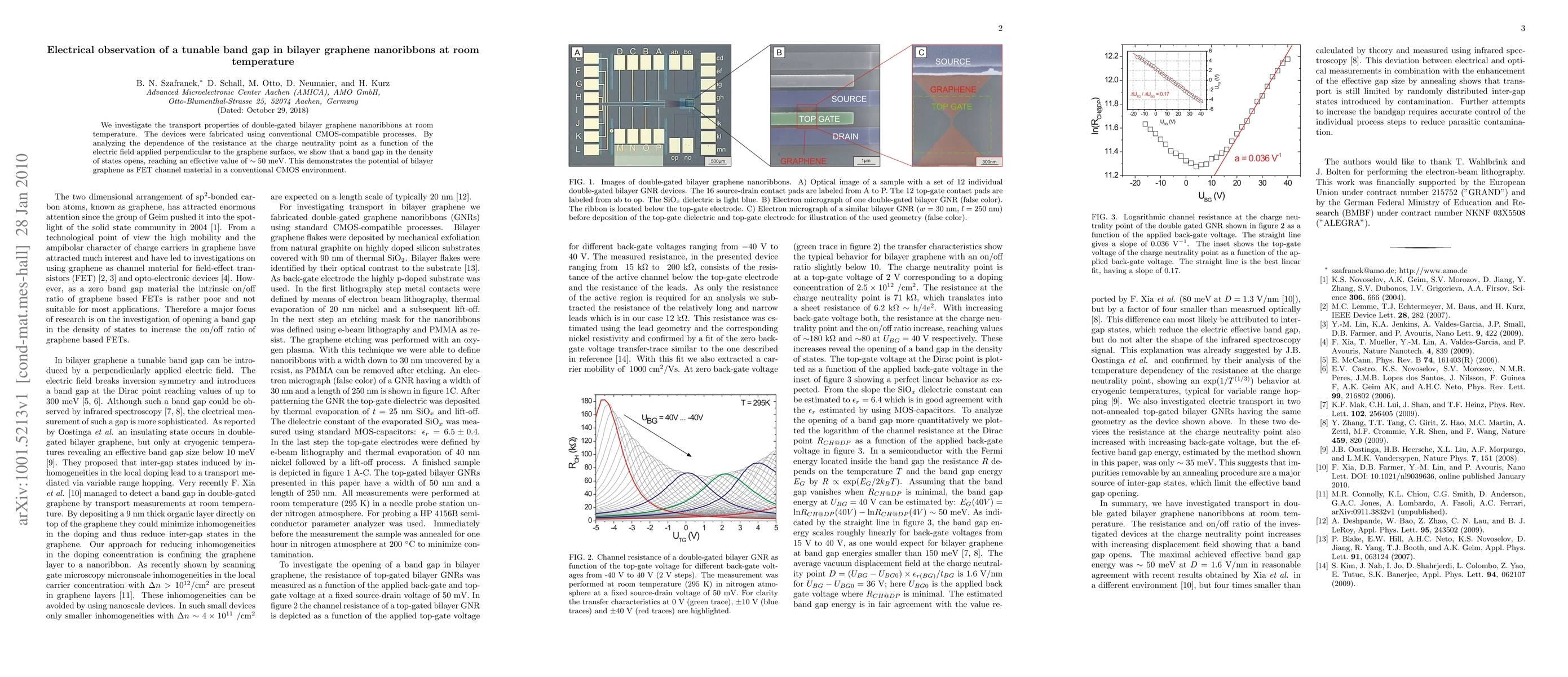 This study demonstrates the tunability of the band gap in bilayer graphene nanoribbons via an applied electric field, achieving an effective band gap of ~50 meV at room temperature, showcasing its potential for use in FET channels in CMOS technology.