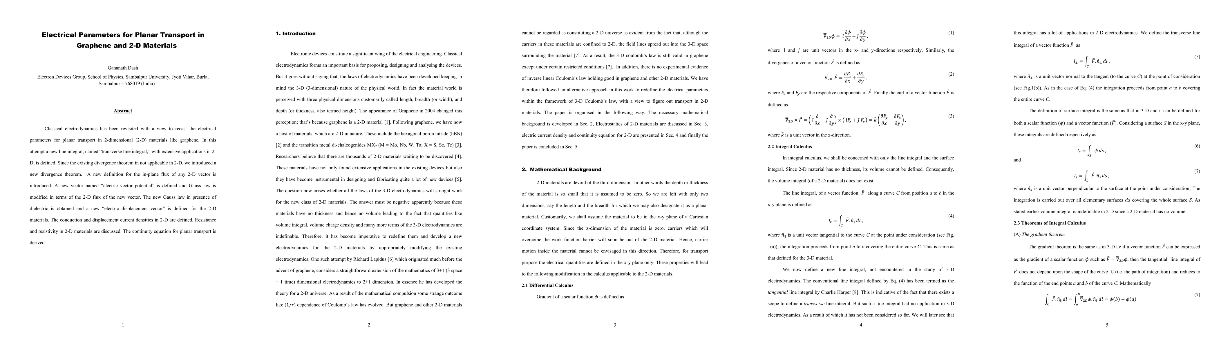 Classical electrodynamics has been revisited with a view to recast the electrical parameters for planar transport in 2-dimensional (2-D) materials like graphene. In this attempt a new line integral, named transverse line integral, with extensive applications in 2-D, is defined. Since the existing divergence theorem in not applicable in 2-D, we introduced a new divergence theorem. A new definition for the in-plane flux of any 2-D vector is introduced. A new vector named electric vector potential is defined and Gauss law is modified in terms of the 2-D flux of the new vector. The new Gauss law in presence of dielectric is obtained and a new electric displacement vector is defined for the 2-D materials. The conduction and displacement current densities in 2-D are defined. Resistance and resistivity in 2-D materials are discussed. The continuity equation for planar transport is derived.