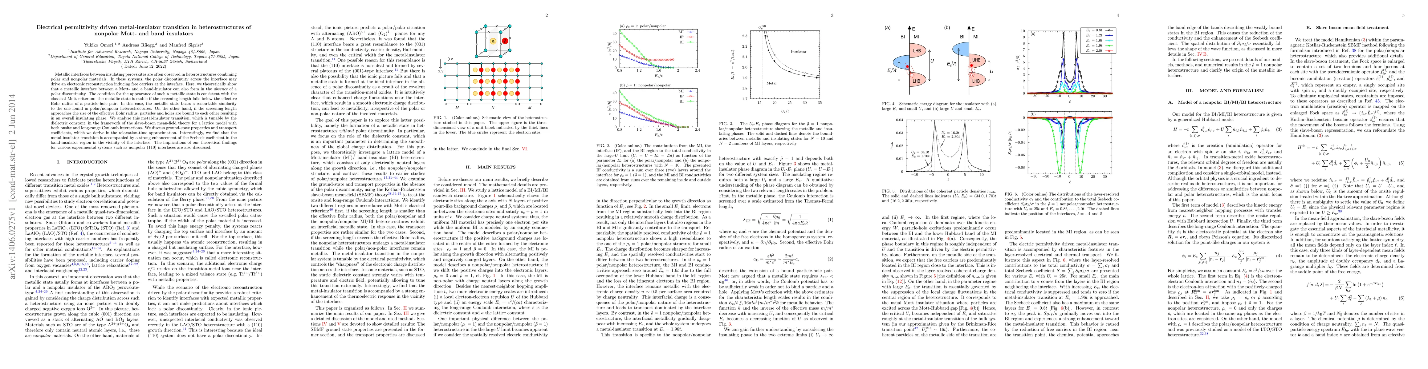 This paper theoretically demonstrates a metal-insulator transition in heterostructures combining Mott and band insulators without a polar discontinuity, driven by electrical permittivity. The transition is governed by the screening length relative to the effective Bohr radius, leading to metallic or insulating states, and is accompanied by a strong enhancement of the Seebeck coefficient near the interface.