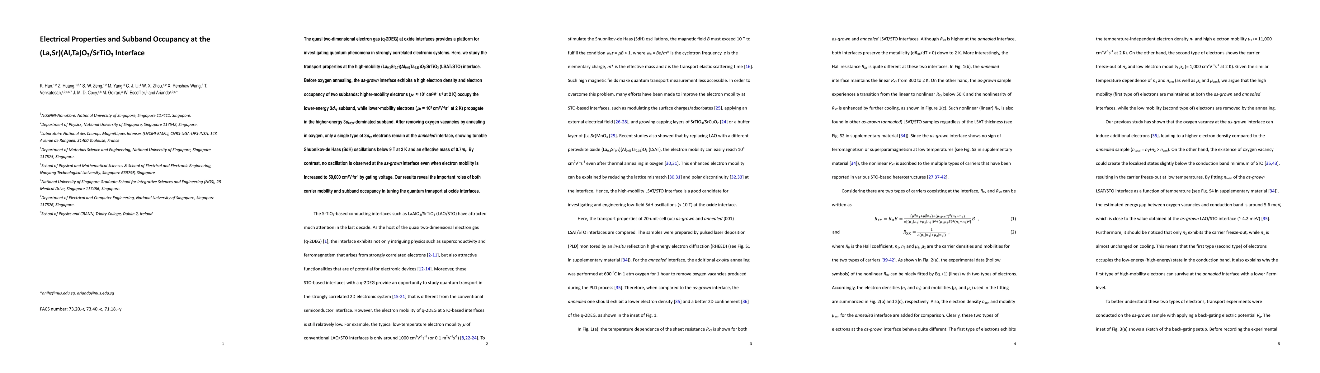 This study investigates the electrical properties and subband occupancy at the LSAT/STO interface, revealing high electron density and dual subband occupancy in the as-grown state. Post-annealing, only lower-mobility electrons remain, showing tunable Shubnikov-de Haas oscillations, indicating the significance of carrier mobility and subband occupancy in quantum transport phenomena.