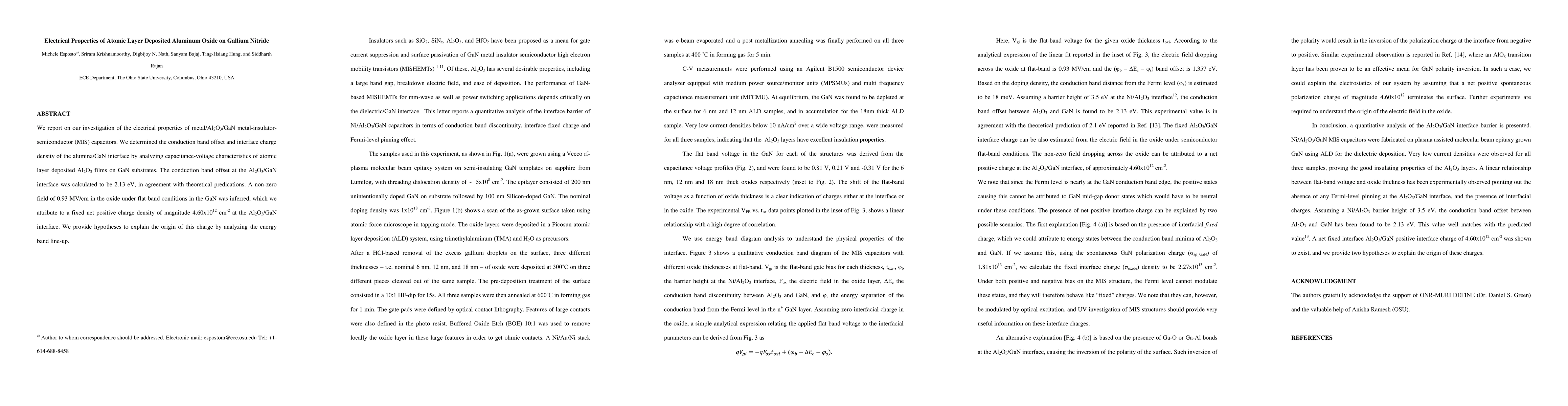 This study investigates the electrical properties of MIS capacitors with Al2O3/GaN interfaces, finding a conduction band offset of 2.13 eV and a fixed net positive charge density of 4.60x10¹² cm⁻², attributed to interface phenomena. The results align with theoretical predictions and provide insights into the energy band line-up.