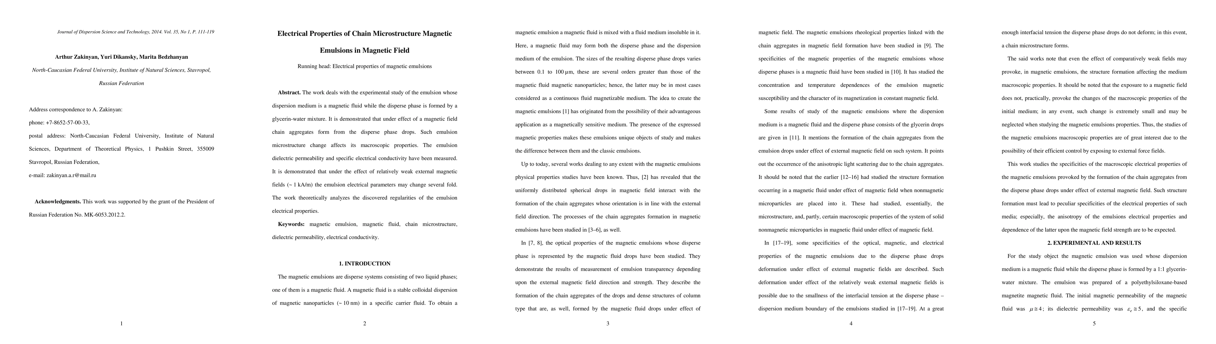 A comprehensive experimental study was conducted to investigate the effects of magnetic fields on the electrical properties of magnetic emulsions.