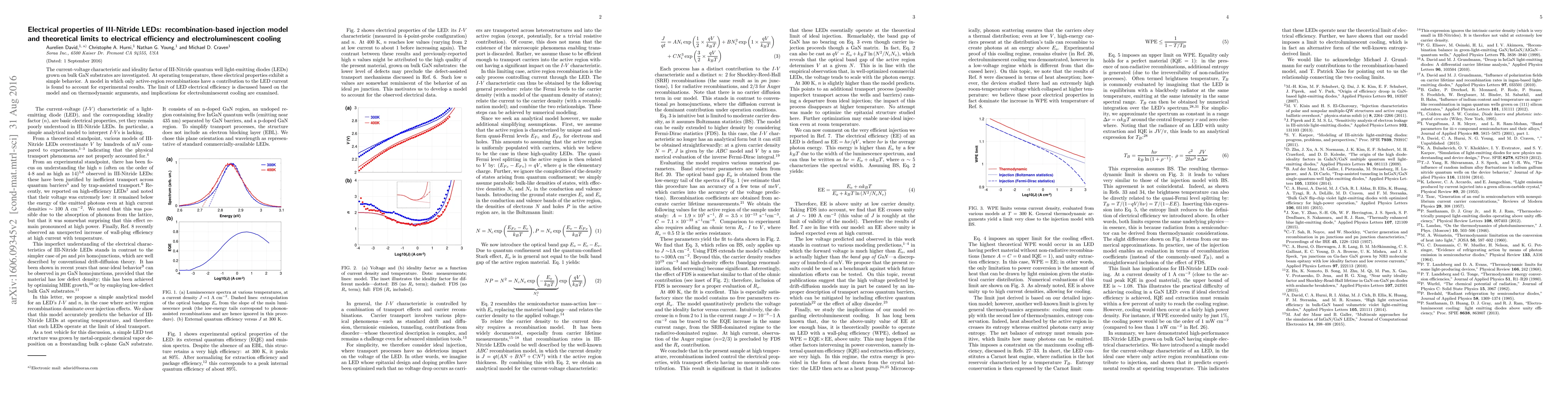The current-voltage characteristic and ideality factor of III-Nitride quantum well light-emitting diodes (LEDs) grown on bulk GaN substrates are investigated. At operating temperature, these electrical properties exhibit a simple behavior. A model in which only active-region recombinations have a contribution to the LED current is found to account for experimental results. The limit of LED electrical efficiency is discussed based on the model and on thermodynamic arguments, and implications for electroluminescent cooling are examined.