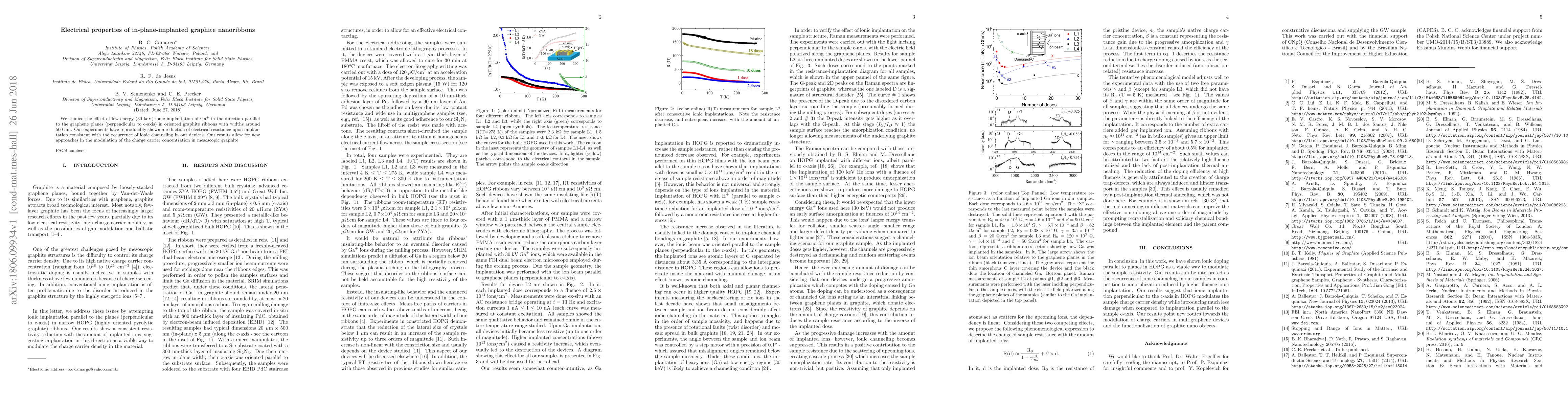 This study investigates the impact of Ga+ ion implantation parallel to graphene planes in graphite nanoribbons, demonstrating a reduction in electrical resistance, likely due to ionic channeling, opening new avenues for modulating charge carrier concentration in mesoscopic graphite.
