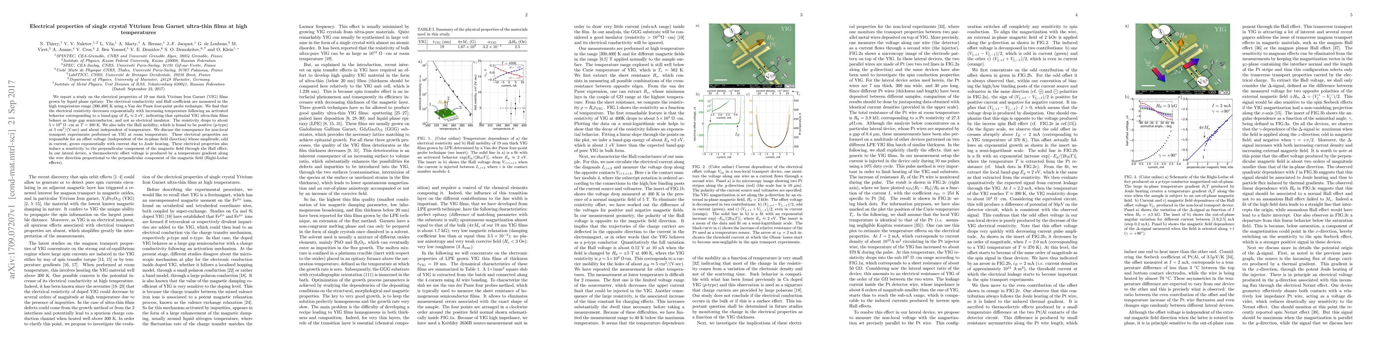 We report a study on the electrical properties of 19 nm thick Yttrium Iron Garnet (YIG) films grown by liquid phase epitaxy. The electrical conductivity and Hall coefficient are measured in the high temperature range [300,400]~K using a Van der Pauw four-point probe technique. We find that the electrical resistivity decreases exponentially with increasing temperature following an activated behavior corresponding to a band-gap of $E_g\approx 2$ eV, indicating that epitaxial YIG ultra-thin films behave as large gap semiconductor, and not as electrical insulator. The resistivity drops to about $5\times 10^3$~$\Omega \cdot \text{cm}$ at $T=400$ K. We also infer the Hall mobility, which is found to be positive ($p$-type) at 5 cm$^2$/(V$\cdot$sec) and about independent of temperature. We discuss the consequence for non-local transport experiments performed on YIG at room temperature. These electrical properties are responsible for an offset voltage (independent of the in-plane field direction) whose amplitude, odd in current, grows exponentially with current due to Joule heating. These electrical properties also induce a sensitivity to the perpendicular component of the magnetic field through the Hall effect. In our lateral device, a thermoelectric offset voltage is produced by a temperature gradient along the wire direction proportional to the perpendicular component of the magnetic field (Righi-Leduc effects).