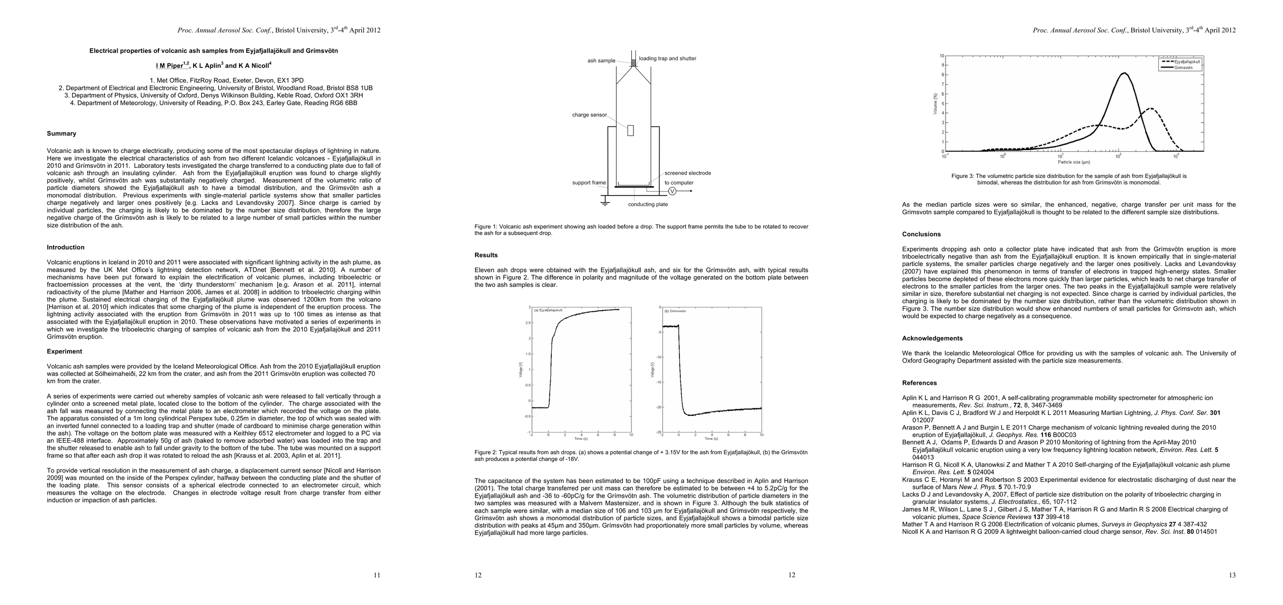 This study investigates the electrical properties of volcanic ash from Eyjafjallajökull and Grímsvötn, finding that Eyjafjallajökull ash charges slightly positively while Grímsvötn ash charges substantially negatively, likely due to the number size distribution of particles, with Grímsvötn's large negative charge attributed to a higher proportion of small particles.