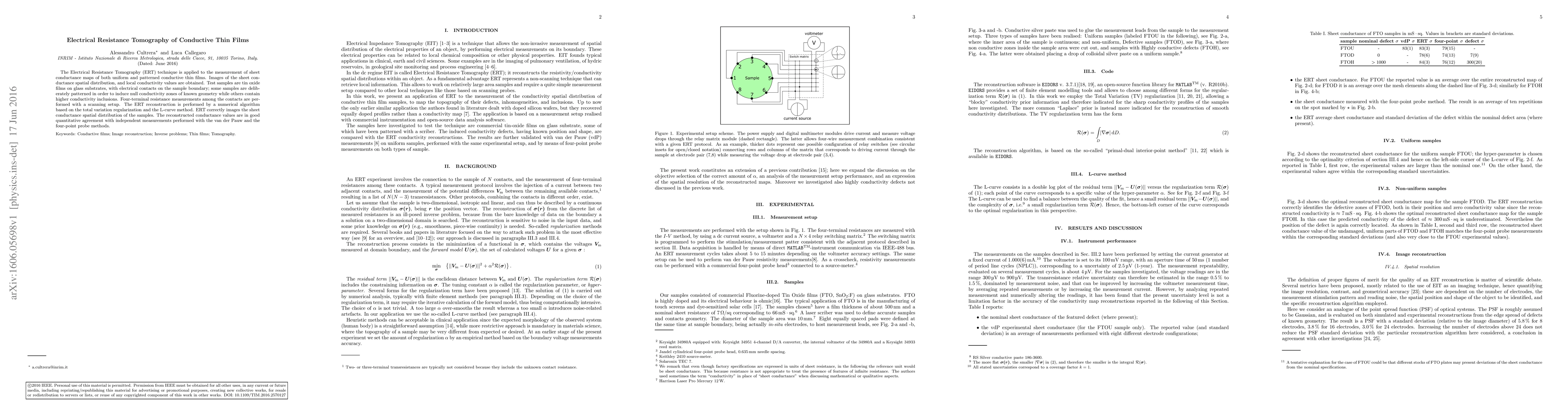 This paper applies Electrical Resistance Tomography to measure sheet conductance maps of conductive thin films, achieving accurate spatial distribution and local conductivity values. The ERT method reconstructs these images using a numerical algorithm, showing good quantitative agreement with independent measurements.