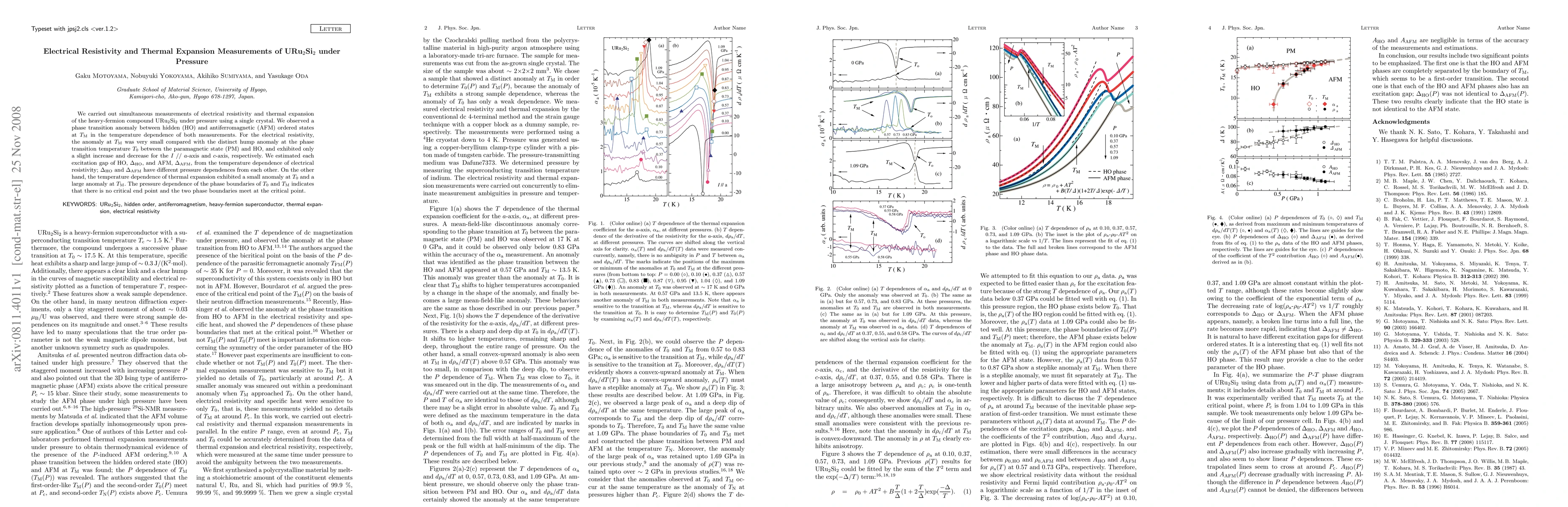 This study investigates the electrical resistivity and thermal expansion of URu2Si2 under pressure, revealing a phase transition anomaly between hidden and antiferromagnetic ordered states, with distinct anomalies in resistivity and thermal expansion, and differing pressure dependencies for excitation gaps. The phase boundaries meet at a critical point without a critical end point.
