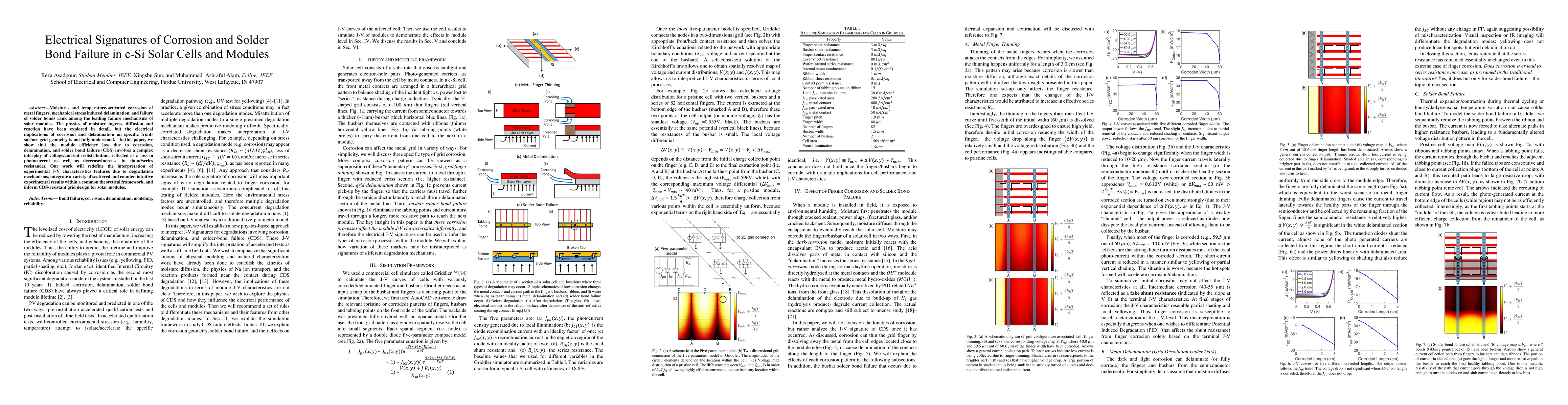 Moisture- and temperature-activated corrosion of metal fingers, mechanical stress induced delamination, and failure of solder bonds rank among the leading failure mechanisms of solar modules. The physics of moisture ingress, diffusion and reaction have been explored in detail, but the electrical implications of corrosion and delamination on specific front-surface grid geometry is not fully understood. In this paper, we show that the module efficiency loss due to corrosion, delamination, and solder bond failure (CDS) involves a complex interplay of voltage/current redistribution, reflected as a loss in photocurrent as well as decrease/increase in shunt/series resistances. Our work will redefine the interpretation of experimental J-V characteristics features due to degradation mechanisms, integrate a variety of scattered and counter-intuitive experimental results within a common theoretical framework, and inform CDS-resistant grid design for solar modules.