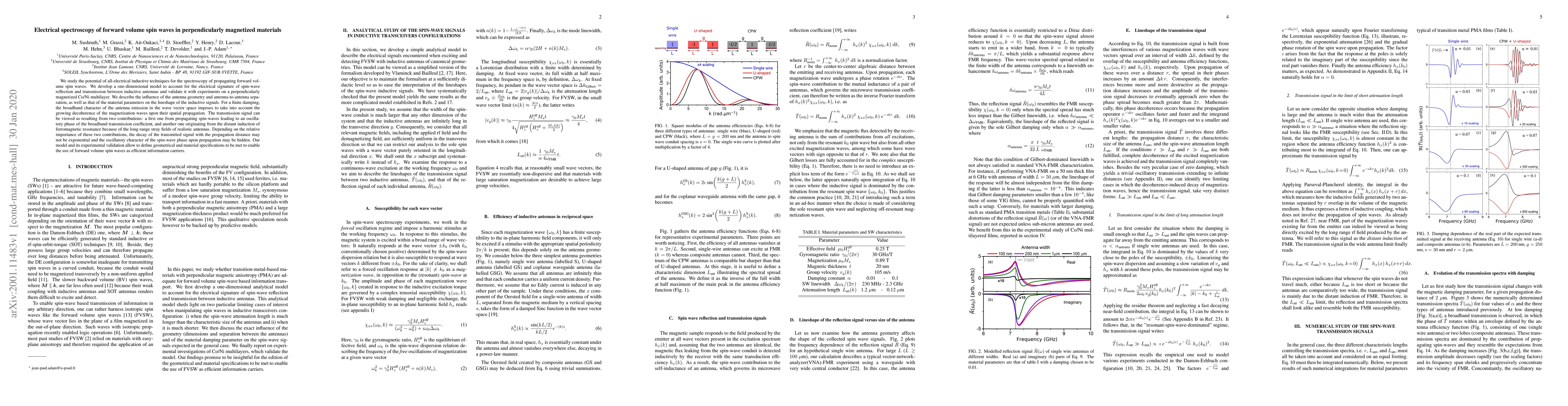 This paper explores the use of all-electrical inductive techniques for spectroscopy of forward volume spin waves in perpendicularly magnetized materials, developing a model to predict the electrical signature of spin-wave interactions and validating it with experiments on Co/Ni multilayers. The study highlights the impact of antenna geometry and material parameters on the inductive signal, revealing complex decay and phase behavior influenced by decoherence and stray fields.