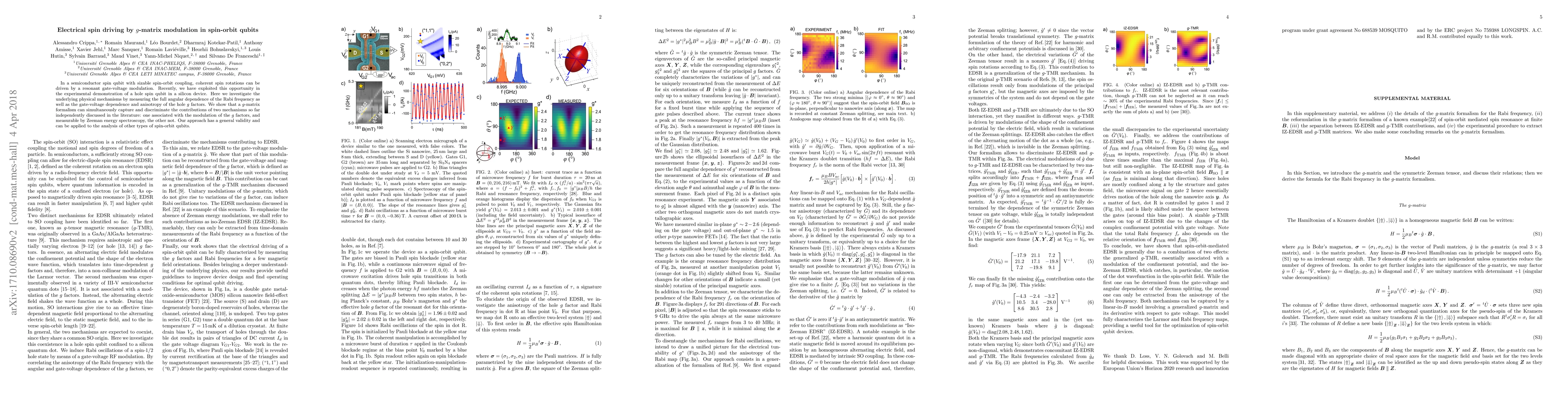 In a semiconductor spin qubit with sizable spin-orbit coupling, coherent spin rotations can be driven by a resonant gate-voltage modulation. Recently, we have exploited this opportunity in the experimental demonstration of a hole spin qubit in a silicon device. Here we investigate the underlying physical mechanisms by measuring the full angular dependence of the Rabi frequency as well as the gate-voltage dependence and anisotropy of the hole $g$-factors. We show that a $g$-matrix formalism can simultaneously capture and discriminate the contributions of two mechanisms so far independently discussed in the literature: one associated with the modulation of the $g$ factors, and measurable by Zeeman energy spectroscopy, the other not. Our approach has a general validity and can be applied to the analysis of other types of spin-orbit qubits.
