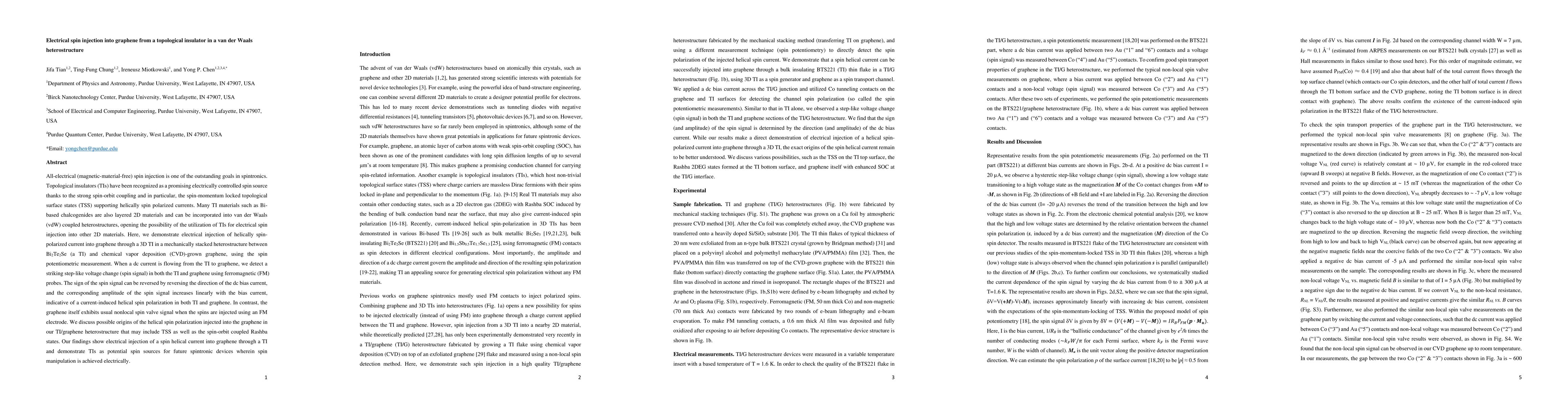 This paper demonstrates the all-electrical spin injection of helically spin-polarized current into graphene from a topological insulator (TI) in a van der Waals heterostructure, using spin potentiometric measurements. The findings suggest TIs as promising spin sources for future spintronic devices, highlighting the potential for magnetic-material-free spin manipulation.