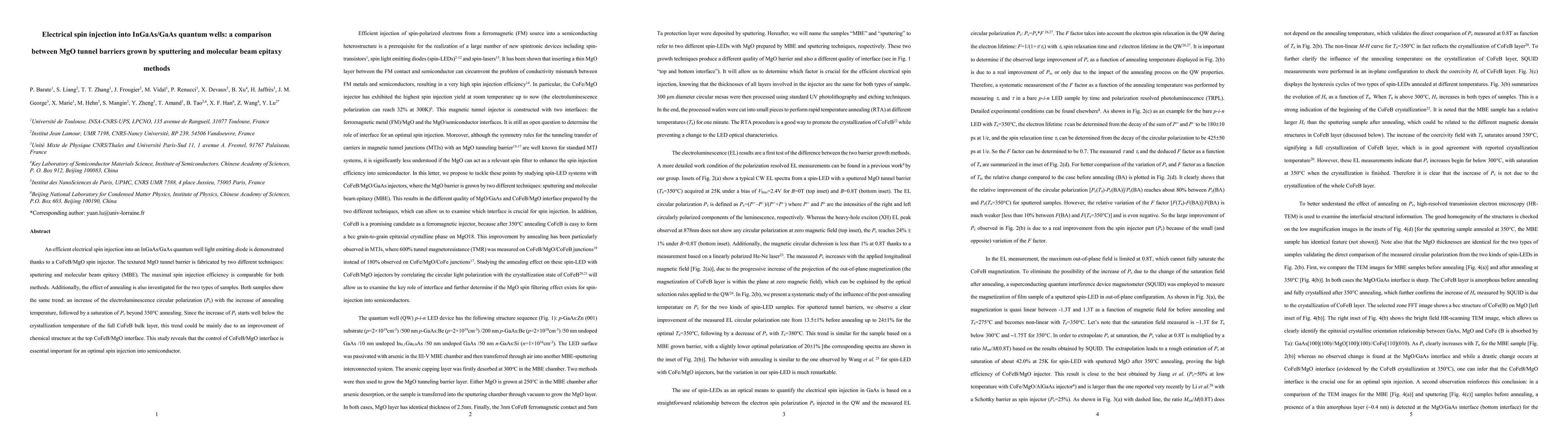 This paper demonstrates efficient electrical spin injection into InGaAs/GaAs quantum wells using CoFeB/MgO spin injectors, comparing MgO tunnel barriers grown via sputtering and molecular beam epitaxy. Both methods yield comparable maximal spin injection efficiency, with annealing improving electroluminescence circular polarization before saturation at 350°C, highlighting the importance of the CoFeB/MgO interface for optimal spin injection.