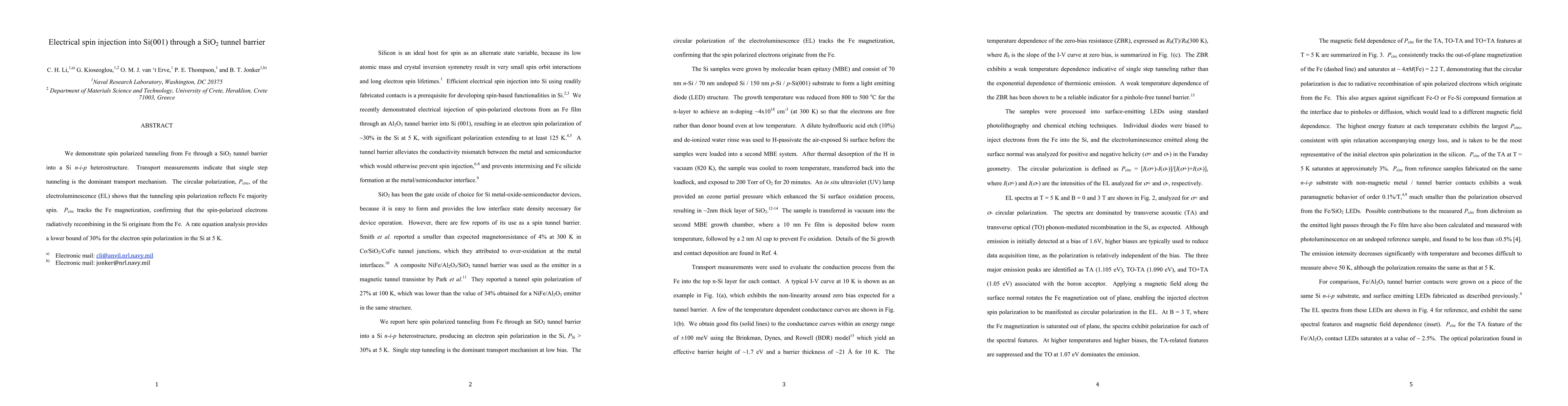This paper demonstrates spin-polarized tunneling from Fe into a Si n-i-p heterostructure via a SiO2 barrier, confirming that the injected spin-polarized electrons originate from Fe majority spin with an estimated 30% spin polarization at 5 K. Circular polarization of electroluminescence verifies the spin polarization.