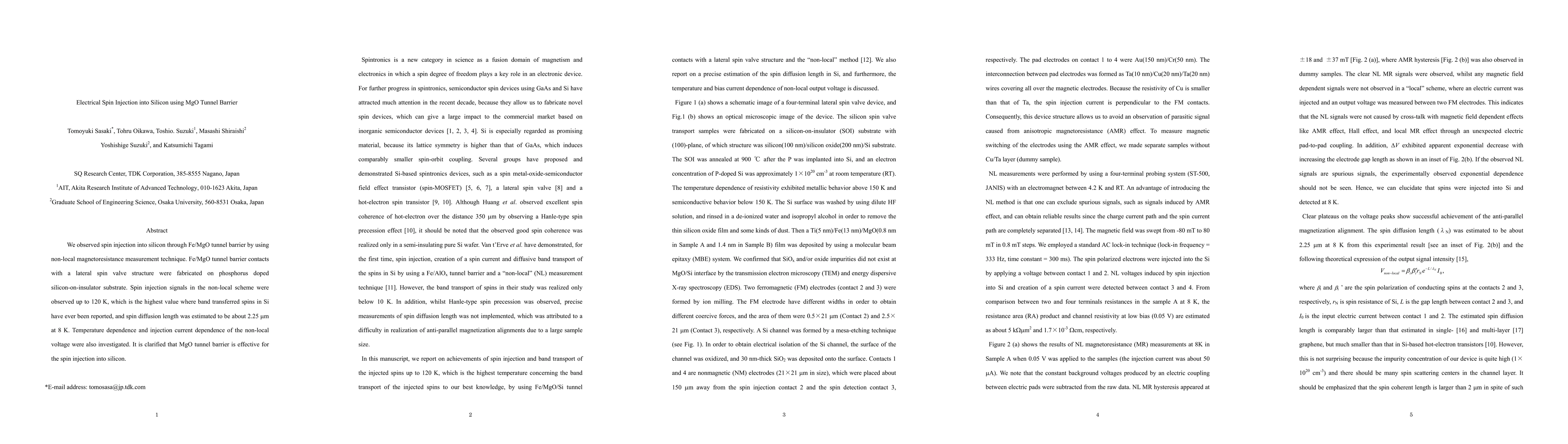 This study demonstrates successful spin injection into silicon via Fe/MgO tunnel barriers at temperatures up to 120K, the highest temperature recorded for such processes, with an estimated spin diffusion length of 2.25um at 8K. The findings highlight the efficacy of MgO barriers for spin transport in silicon.