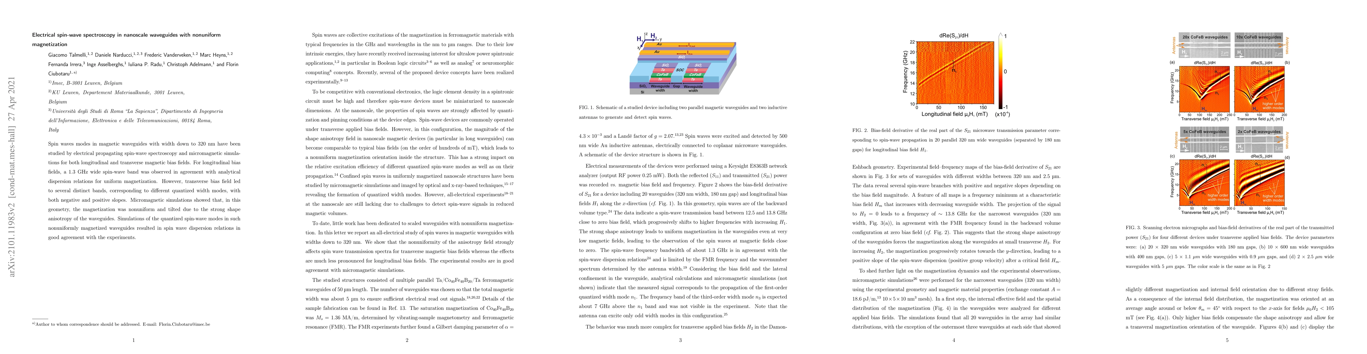 This study investigates spin-wave modes in nanoscale magnetic waveguides using electrical spectroscopy and micromagnetic simulations. For longitudinal bias fields, a single 1.3 GHz spin-wave band was observed, while transverse fields revealed multiple bands due to nonuniform magnetization and tilted magnetization from shape anisotropy.
