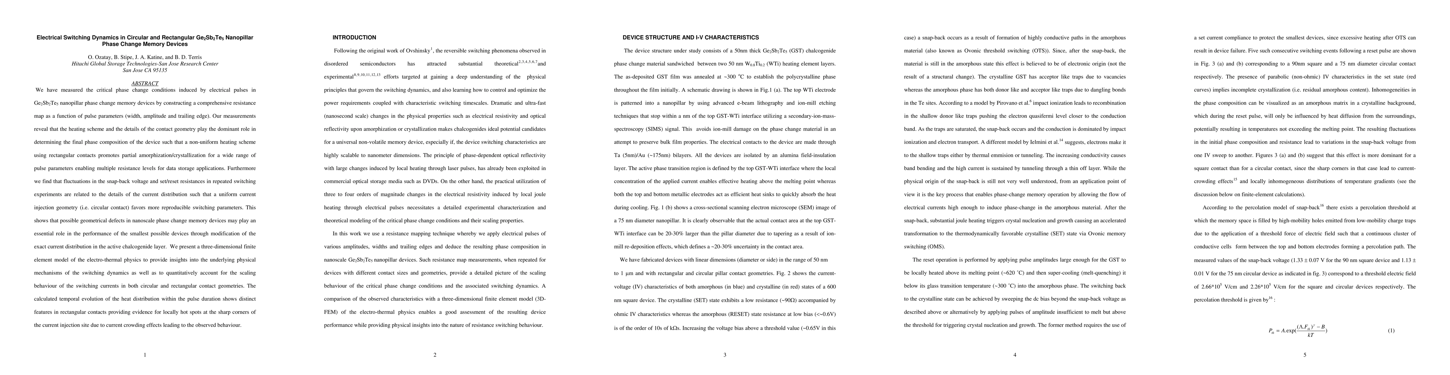 Researchers studied electrical switching dynamics in Ge2Sb2Te5 nanopillar phase change memory devices with circular and rectangular contacts, finding that non-uniform heating schemes promote partial amorphization/crystallization for multiple resistance levels.