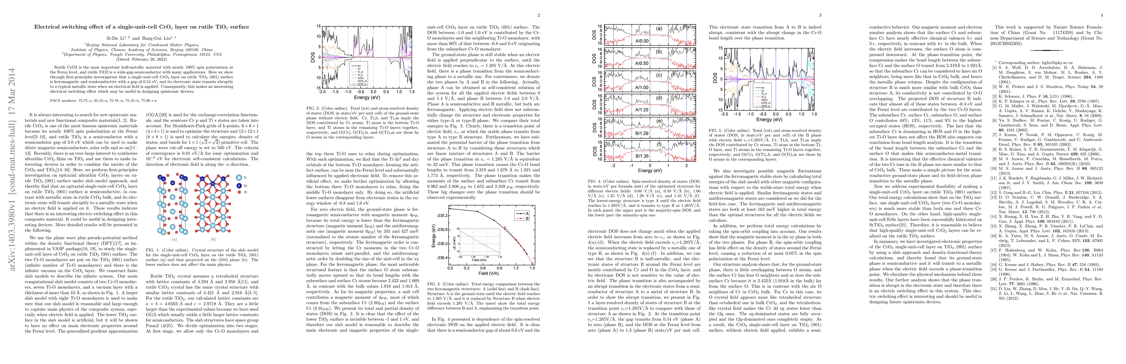 This research demonstrates that a single-unit-cell CrO2 layer on rutile TiO2 surface exhibits ferromagnetic and semiconductive properties, transitioning to a metallic state under an applied electrical field, indicating potential for spintronic device applications.