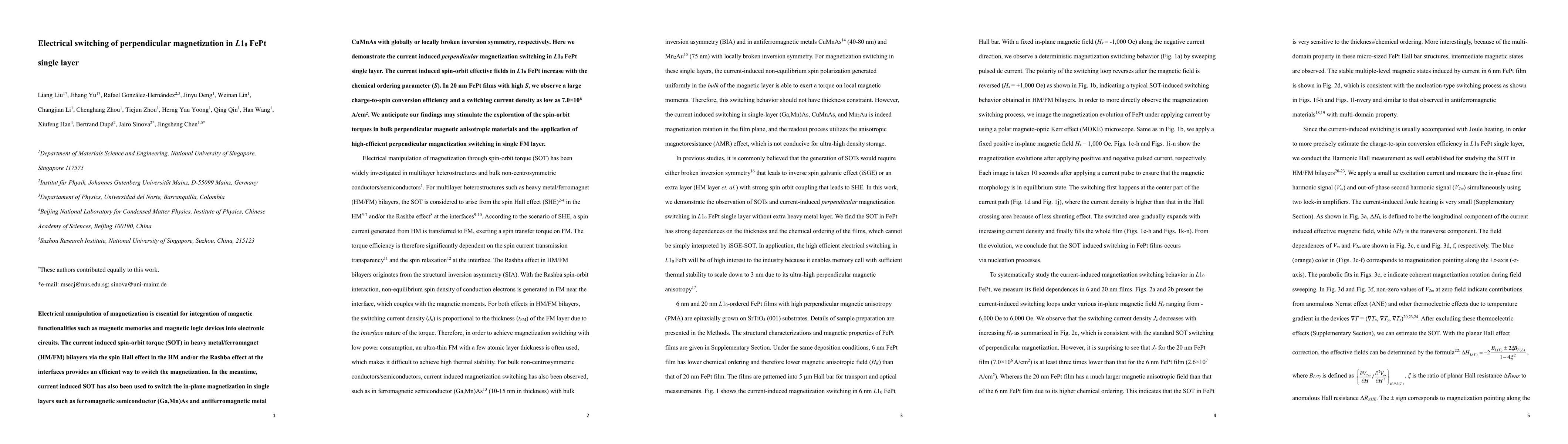 This paper demonstrates the efficient electrical switching of perpendicular magnetization in L10 FePt single layers using current-induced spin-orbit torque, achieving low switching current densities of 7.0E6 A/cm² in highly ordered films, which could enhance magnetic memory and logic device integration.