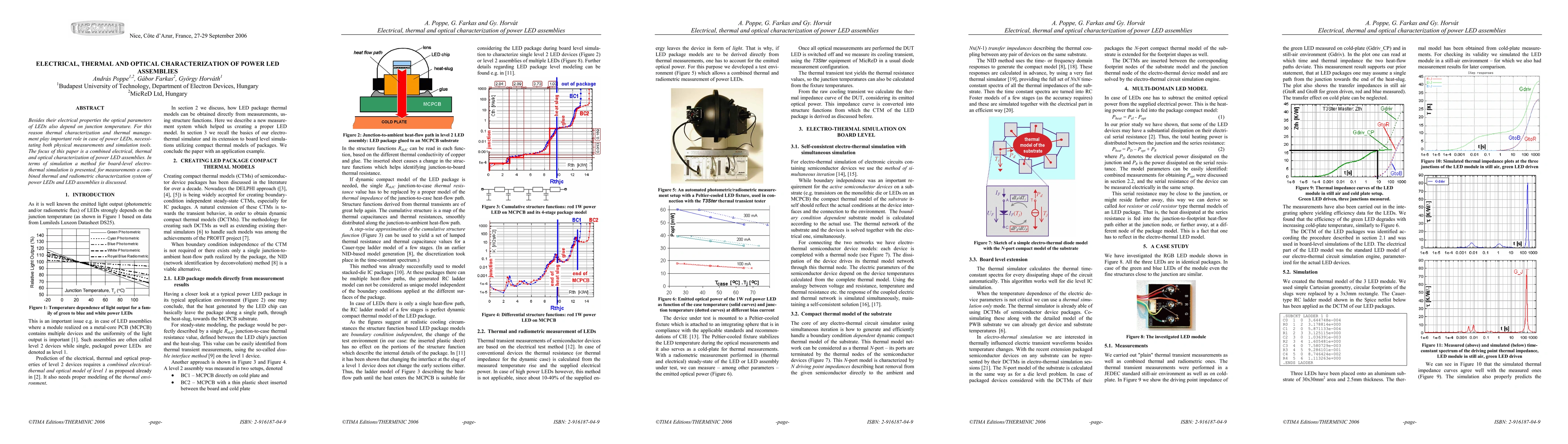 This paper presents a combined electrical, thermal, and optical characterization of power LED assemblies, utilizing both simulation methods for board-level electro-thermal analysis and a combined thermal and radiometric measurement system. The study compares simulation results with measurements in a case study.
