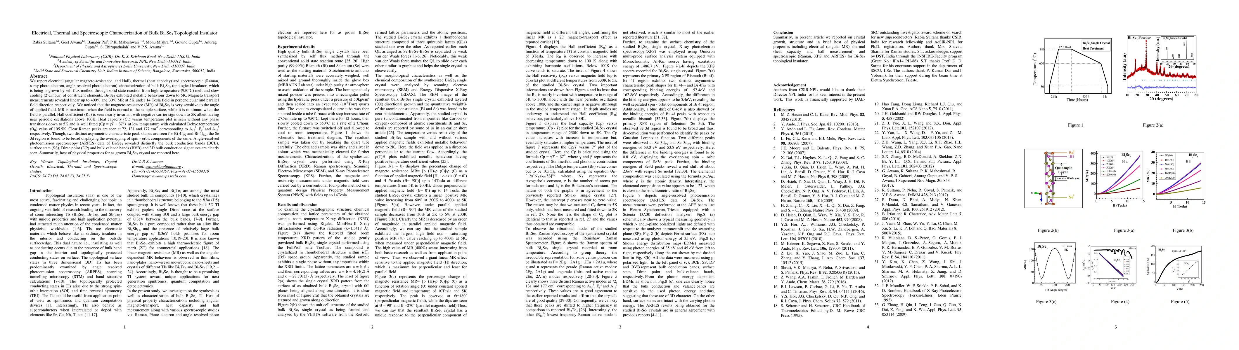 This paper characterizes bulk Bi2Se3 topological insulator using electrical, thermal, and spectroscopic methods, revealing metallic behavior down to 5K, significant magneto-resistance, and distinct surface states via ARPES. The study also identifies Raman peaks and analyzes heat capacity.