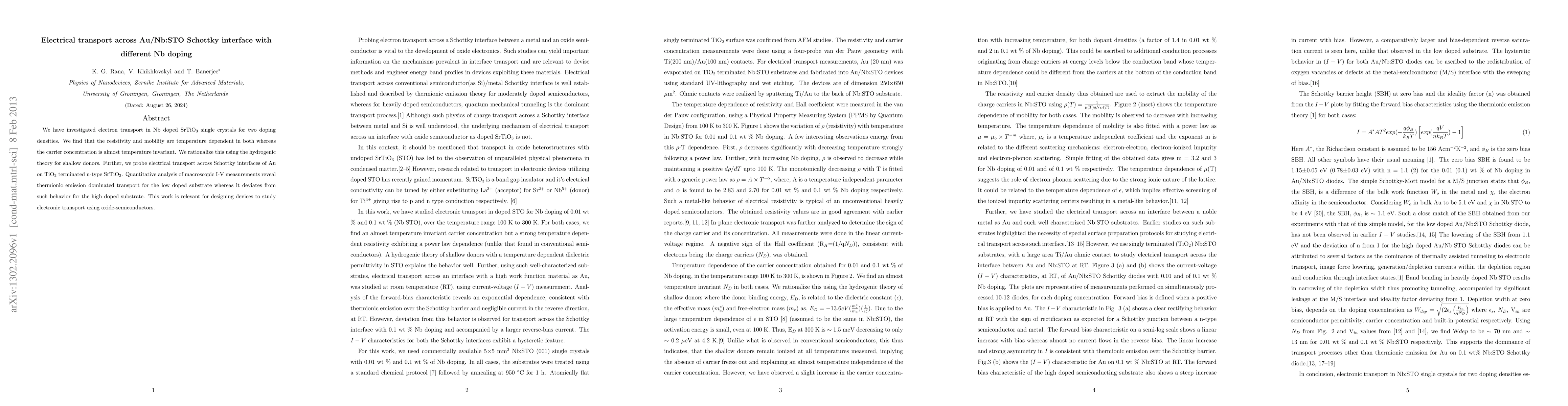 This study investigates electron transport in Nb-doped SrTiO$_3$ with varying doping densities, finding temperature-dependent resistivity and mobility but nearly invariant carrier concentration. The research also examines electrical transport across Au/Nb:SrTiO$_3$ Schottky interfaces, revealing thermionic emission for low doping but deviation from this behavior in high doping.