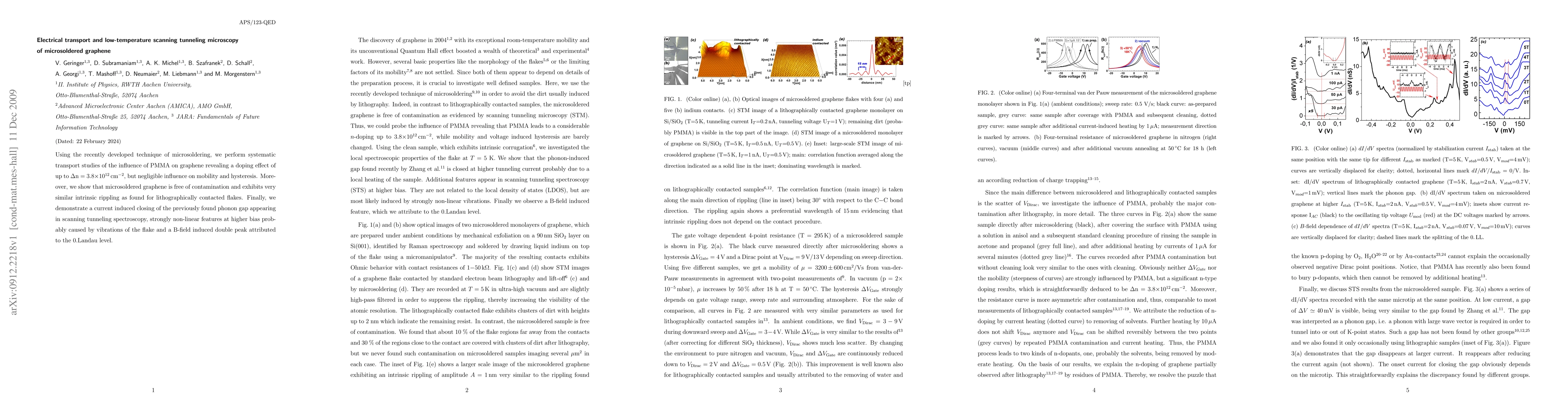 Using the recently developed technique of microsoldering, we perform a systematic transport study of the influence of PMMA on graphene flakes revealing a doping effect of up to 3.8x10^12 1/cm^2, but a negligible influence on mobility and gate voltage induced hysteresis. Moreover, we show that the microsoldered graphene is free of contamination and exhibits a very similar intrinsic rippling as has been found for lithographically contacted flakes. Finally, we demonstrate a current induced closing of the previously found phonon gap appearing in scanning tunneling spectroscopy experiments, strongly non-linear features at higher bias probably caused by vibrations of the flake and a B-field induced double peak attributed to the 0.Landau level of graphene.
