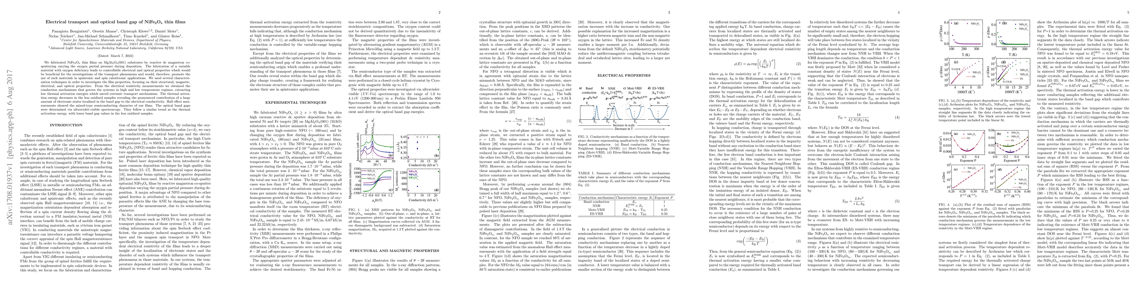 We fabricated NiFe$_\textrm{2}$O$_\textrm{x}$ thin films on MgAl$_2$O$_4$(001) substrates by reactive dc magnetron co-sputtering varying the oxygen partial pressure during deposition. The fabrication of a variable material with oxygen deficiency leads to controllable electrical and optical properties which would be beneficial for the investigations of the transport phenomena and would, therefore, promote the use of such materials in spintronic and spin caloritronic applications. We used several characterization techniques in order to investigate the film properties, focusing on their structural, magnetic, electrical, and optical properties. From the electrical resistivity measurements we obtained the conduction mechanisms that govern the systems in high and low temperature regimes, extracting low thermal activation energies which unveil extrinsic transport mechanisms. The thermal activation energy decreases in the less oxidized samples revealing the pronounced contribution of a large amount of electronic states localized in the band gap to the electrical conductivity. Hall effect measurements showed the mixed-type semiconducting character of our films. The optical band gaps were determined via ultraviolet-visible spectroscopy. They follow a similar trend as the thermal activation energy, with lower band gap values in the less oxidized samples.