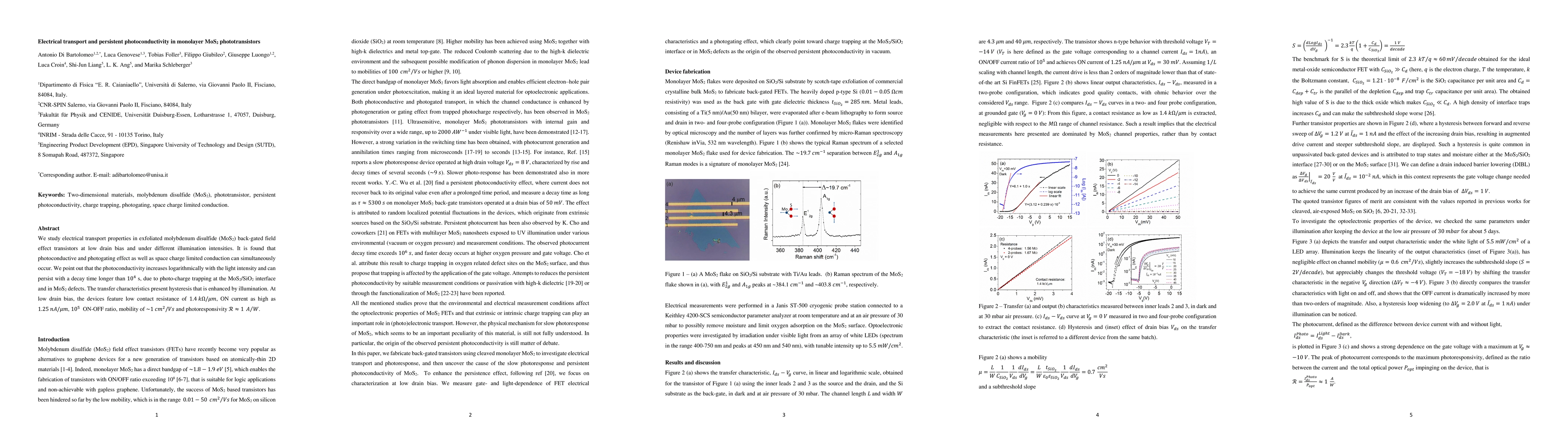 We study electrical transport properties in exfoliated molybdenum disulfide (MoS2) back-gated field effect transistors at low drain bias and under different illumination intensities. It is found that photoconductive and photogating effect as well as space charge limited conduction can simultaneously occur. We point out that the photoconductivity increases logarithmically with the light intensity and can persist with a decay time longer than 10^4 s, due to photo-charge trapping at the MoS2/SiO2 interface and in MoS2 defects. The transfer characteristics present hysteresis that is enhanced by illumination. At low drain bias, the devices feature low contact resistance of 1.4 k{\Omega}/{\mu}m, ON current as high as 1.25 nA/{\mu}m, 10^5 ON-OFF ratio, mobility of 1 cm^2/Vs and photoresponsivity R=1 A/W.