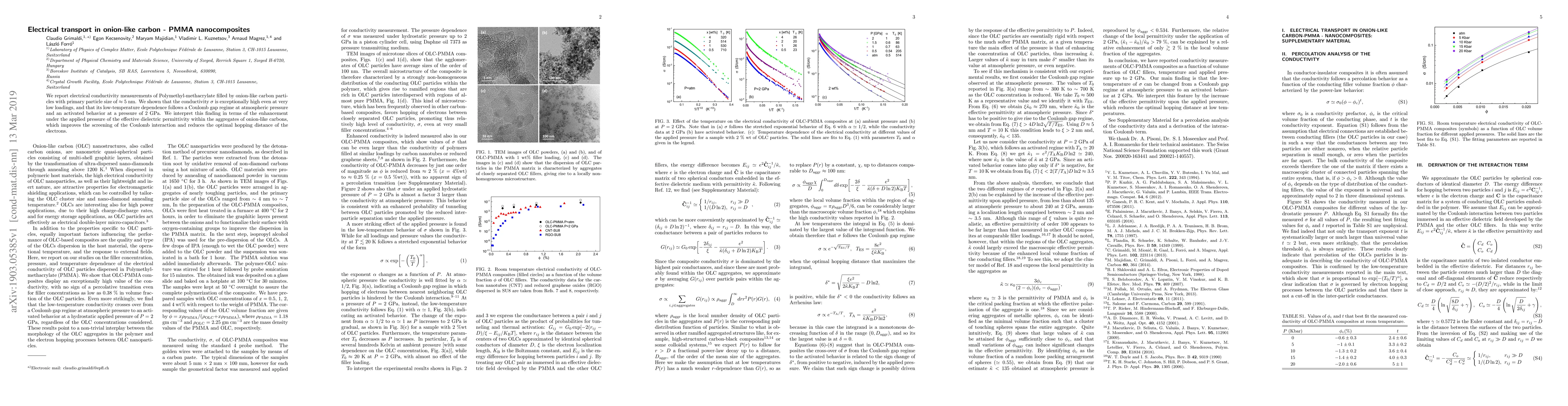 This study investigates the electrical conductivity of Polymethyl-methacrylate (PMMA) nanocomposites filled with onion-like carbon particles, revealing exceptionally high conductivity at low filler loadings. The conductivity exhibits a Coulomb gap regime at atmospheric pressure and an activated behavior under high pressure, attributed to enhanced dielectric permittivity and reduced electron hopping distance under pressure.