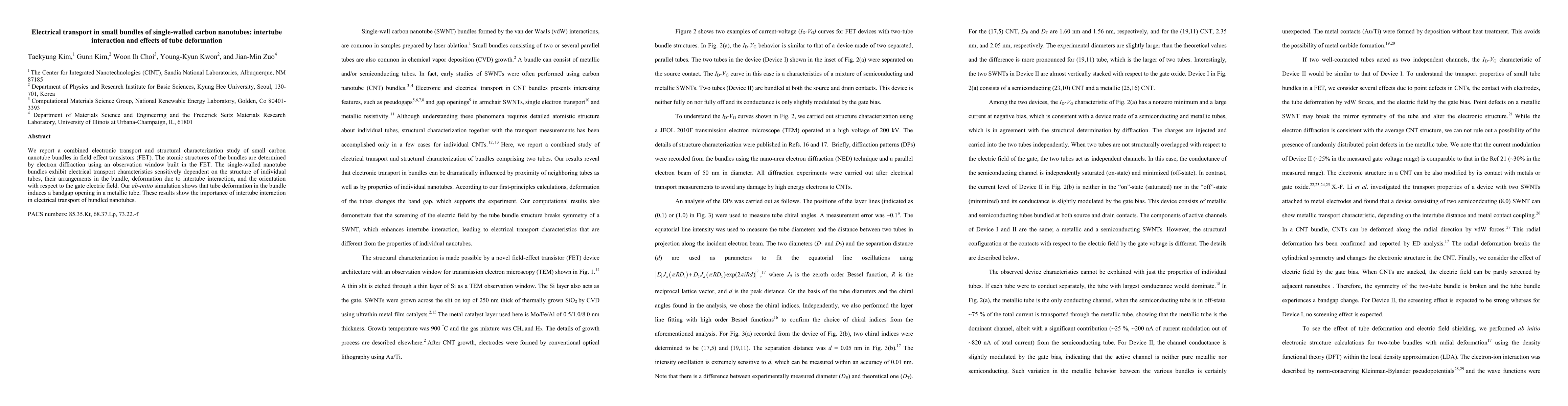 We report a combined electronic transport and structural characterization study of small carbon nanotube bundles in field-effect transistors (FET). The atomic structures of the bundles are determined by electron diffraction using an observation window built in the FET. The single-walled nanotube bundles exhibit electrical transport characteristics sensitively dependent on the structure of individual tubes, their arrangements in the bundle, deformation due to intertube interaction, and the orientation with respect to the gate electric field. Our ab-initio simulation shows that tube deformation in the bundle induces a bandgap opening in a metallic tube. These results show the importance of intertube interaction in electrical transport of bundled nanotubes.