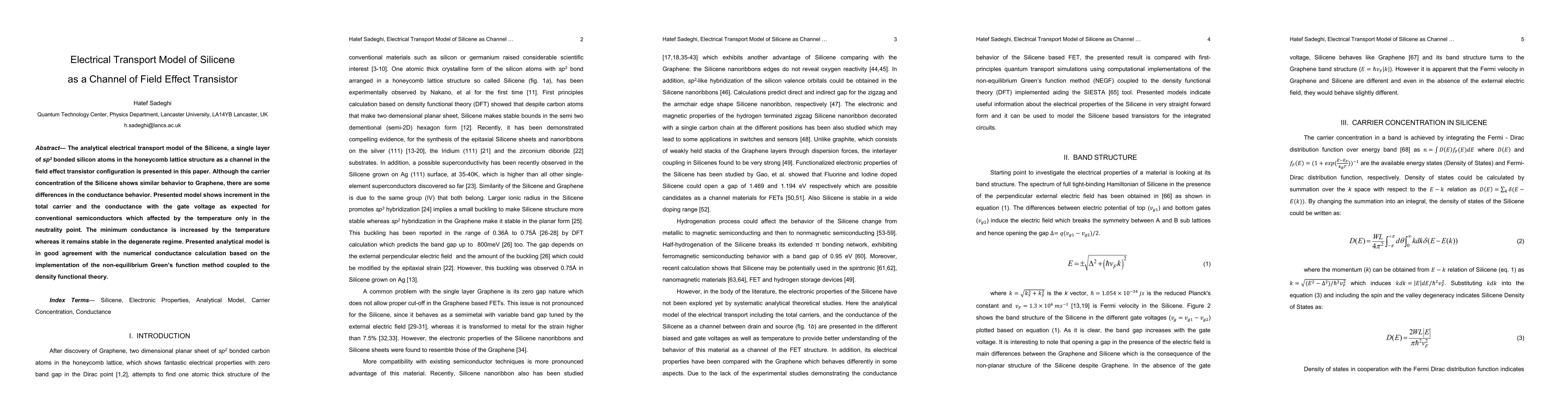 This paper presents an analytical model for the electrical transport in Silicene, a single-layer silicon structure, used as a channel in field effect transistors. The model reveals differences in conductance behavior compared to Graphene, showing increased total carrier and conductance with gate voltage, and temperature effects primarily at neutrality points.