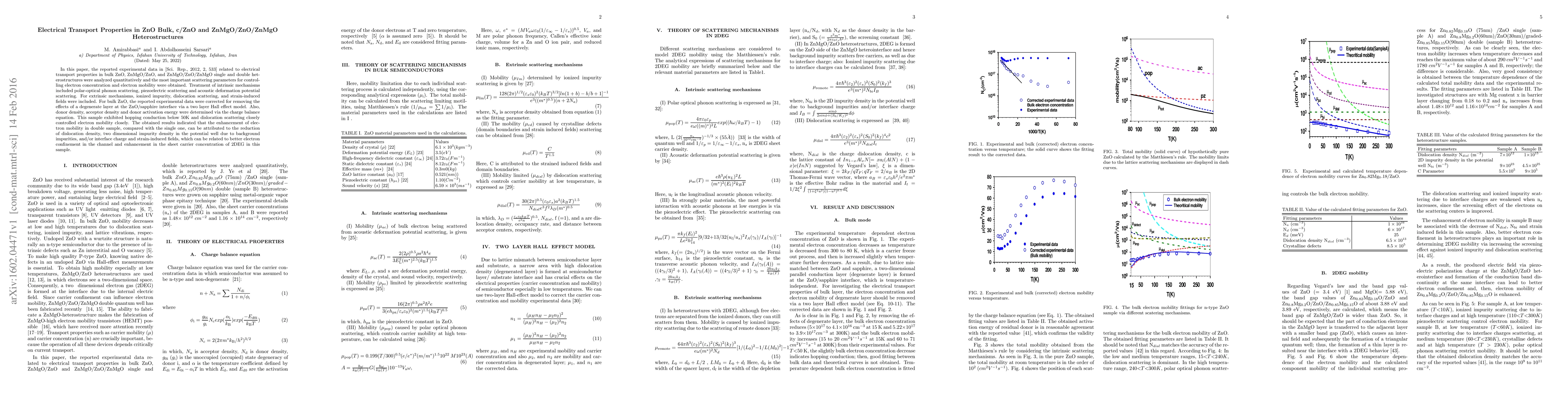 In this paper, the reported experimental data in [Sci. Rep., 2012, 2, 533] related to electrical transport properties in bulk ZnO, ZnMgO/ZnO, and ZnMgO/ZnO/ZnMgO single and double heterostructures were analyzed quantitatively and the most important scattering parameters for controlling electron concentration and electron mobility were obtained. Treatment of intrinsic mechanisms included polar-optical phonon scattering, piezoelectric scattering and acoustic deformation potential scattering. For extrinsic mechanisms, ionized impurity, dislocation scattering, and strain-induced fields were included. For bulk ZnO, the reported experimental data were corrected for removing the effects of a degenerate layer at the ZnO/sapphire interface via a two layer Hall effect model. Also, donor density, acceptor density and donor activation energy were determined via the charge balance equation. This sample exhibited hopping conduction below 50K and dislocation scattering closely controlled electron mobility closely. The obtained results indicated that the enhancement of electron mobility in double sample, compared with the single one, can be attributed to the reduction of dislocation density, two dimensional impurity density in the potential well due to background impurities, and/or interface charge and strain-induced fields, which can be related to better electron confinement in the channel and enhancement in the sheet carrier concentration of 2DEG in this sample.