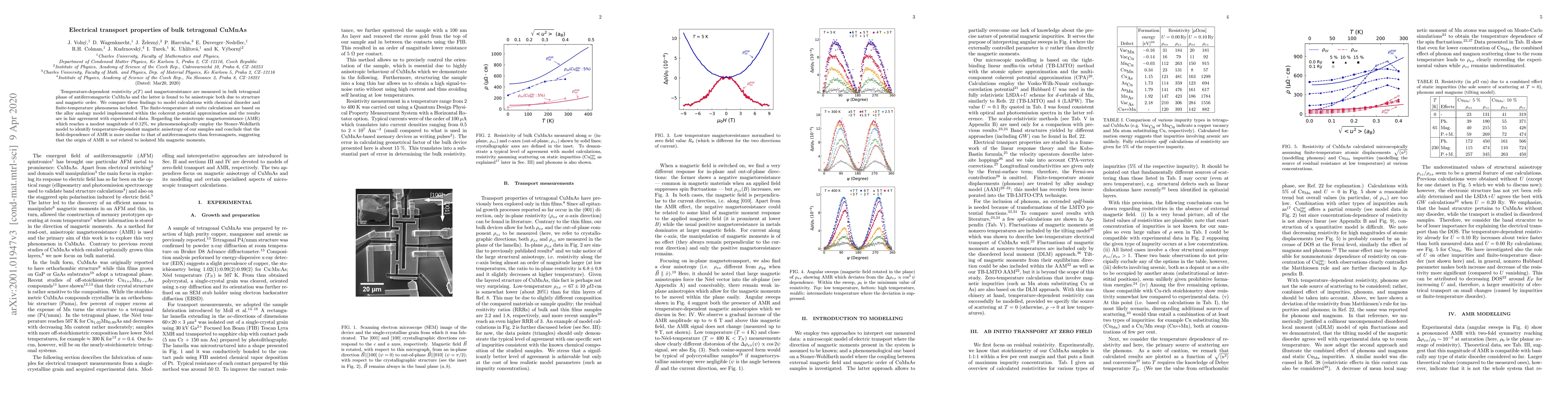 This study investigates the electrical transport properties of bulk tetragonal CuMnAs, revealing anisotropic resistivity and magnetoresistance due to its structure and magnetic order. Theoretical calculations using the alloy analogy model align well with experimental data, and analysis of anisotropic magnetoresistance suggests its origin is more akin to antiferromagnetic behavior than ferromagnetic.