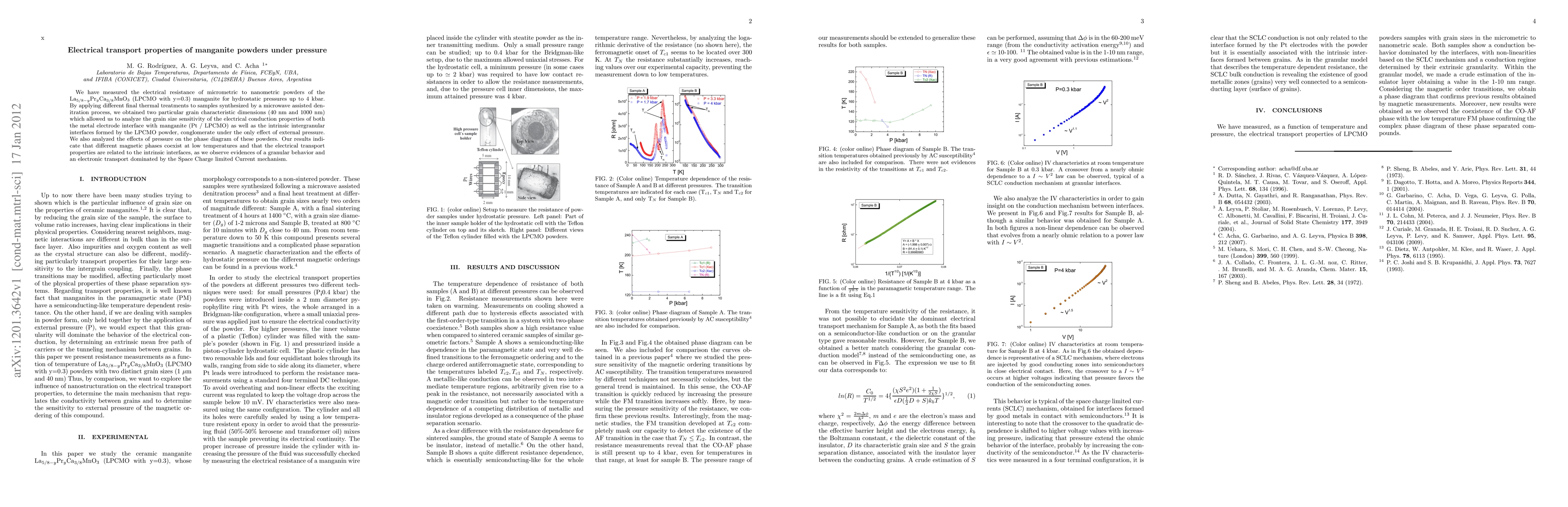 This study investigates the electrical resistance of La$_{5/8-y}$Pr$_{0.3}$Ca$_{3/8}$MnO$_3$ manganite powders under pressure, revealing that grain size significantly influences electrical conduction, with evidence of granular behavior and Space Charge limited Current mechanism dominating transport. Pressure affects the phase diagram, showing coexistence of different magnetic phases at low temperatures.