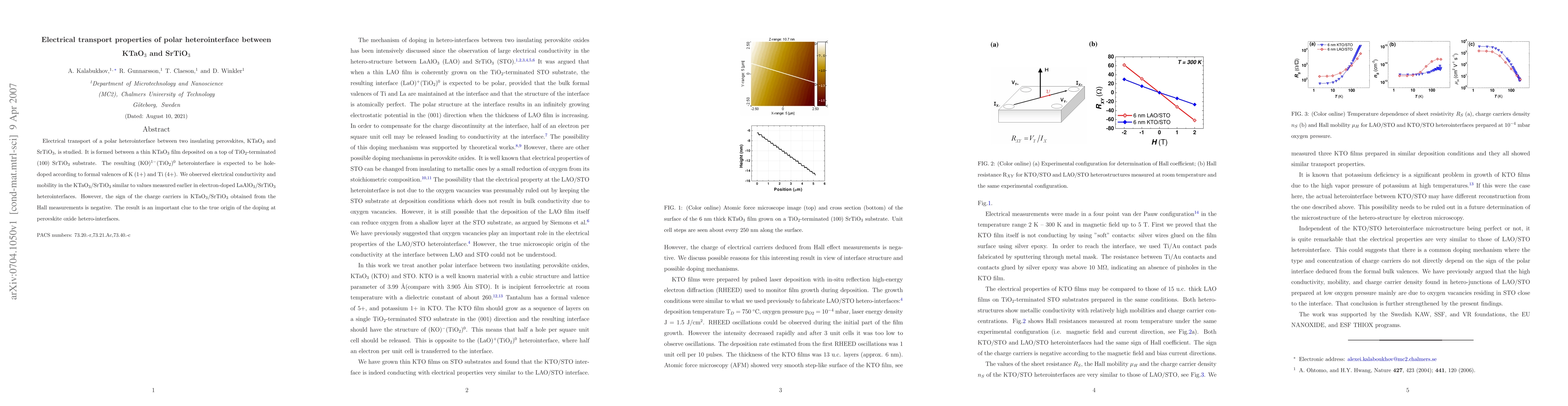 This study investigates the electrical transport properties of a polar heterointerface between KTaO3 and SrTiO3, revealing unexpected hole-doping despite formal valence expectations. The observed negative charge carrier sign from Hall measurements indicates a novel doping mechanism at perovskite oxide interfaces.