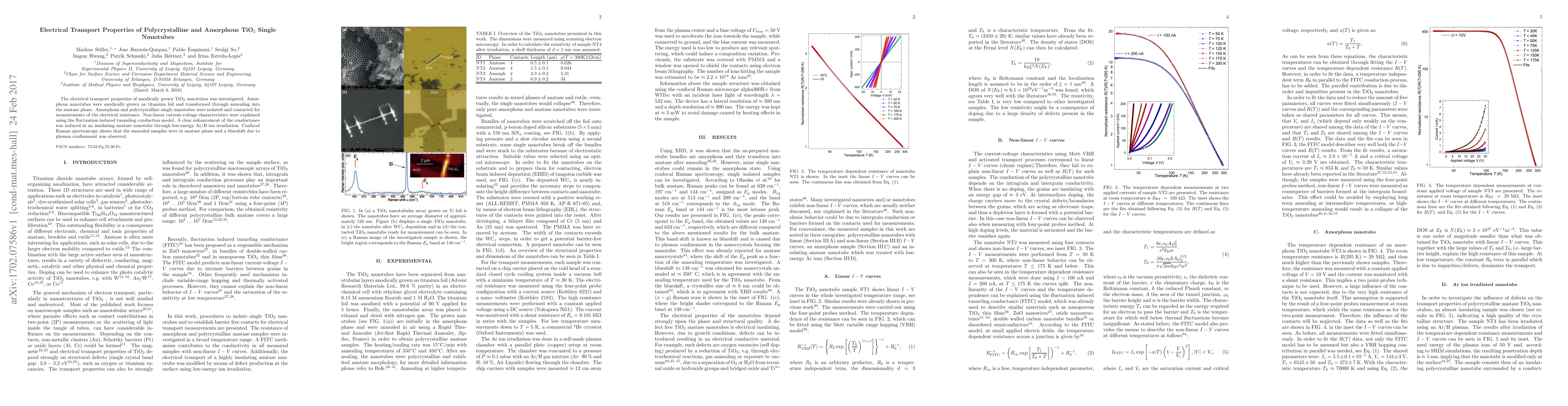 The paper presents a detailed analysis of electrical transport properties of TiO2 nanotubes using advanced characterization techniques, including Raman spectroscopy and low-energy ion irradiation.