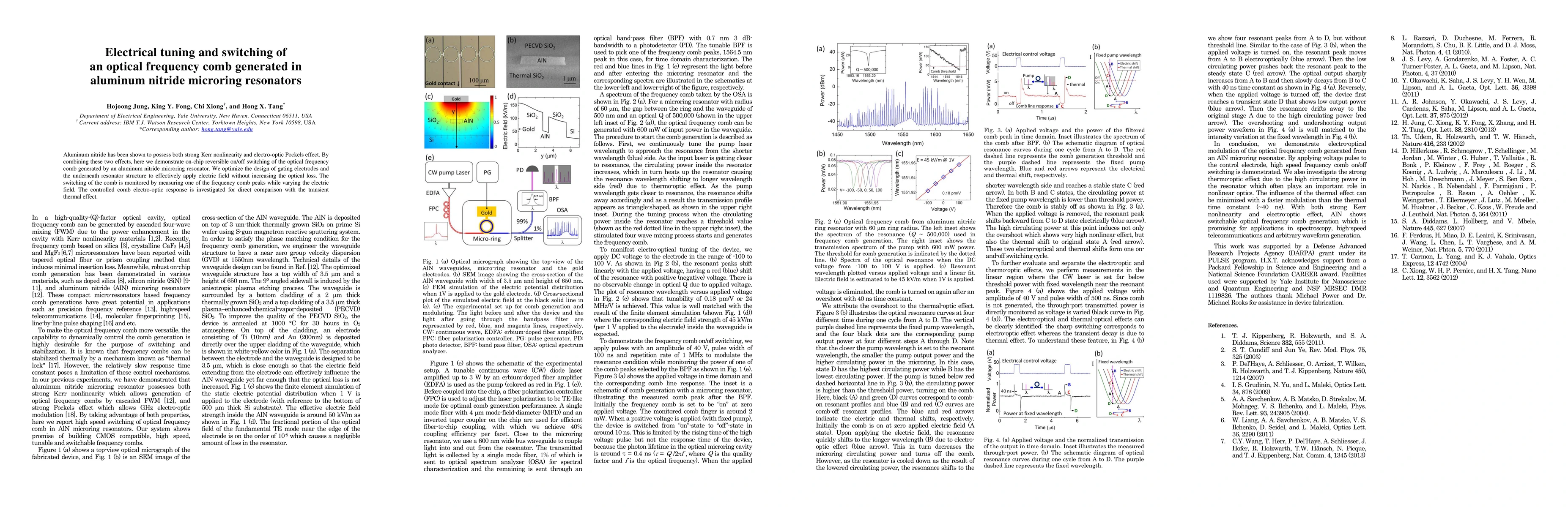 This study demonstrates on-chip switching of an optical frequency comb in aluminum nitride microring resonators by combining Kerr nonlinearity and electro-optic Pockels effect, optimizing electrode design to minimize optical loss while effectively applying electric fields. The switching performance is compared with transient thermal effects.