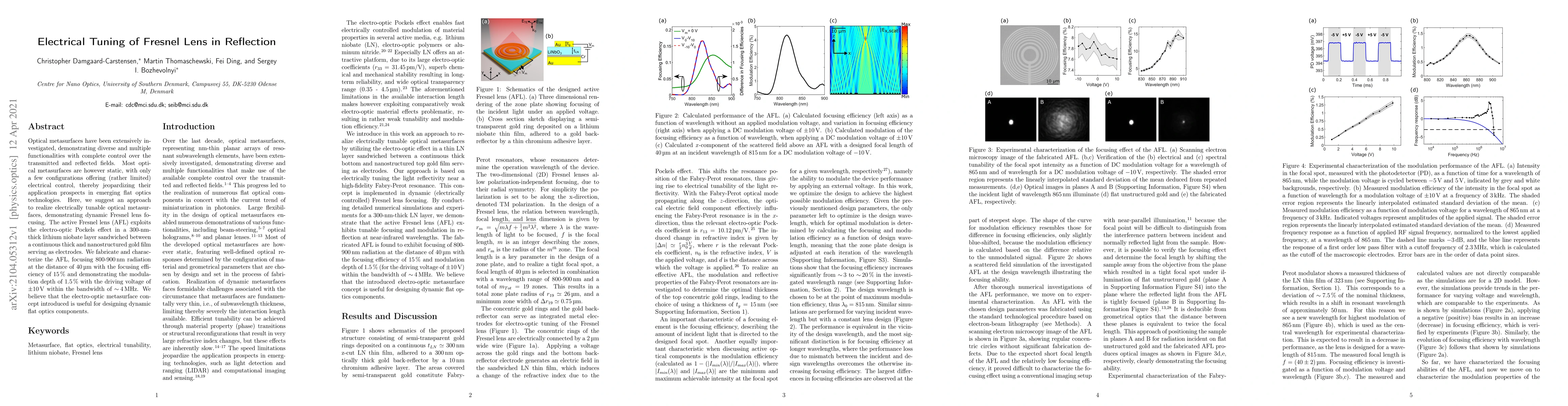 This paper proposes an electrically tunable optical metasurface using the electro-optic Pockels effect in lithium niobium, demonstrating dynamic Fresnel lens focusing with a modulation depth of 1.5% at 800-900 nm wavelengths. The active lens is fabricated with a 300-nm-thick lithium niobium layer between gold electrodes, achieving a focus at 40 μm with 15% efficiency.