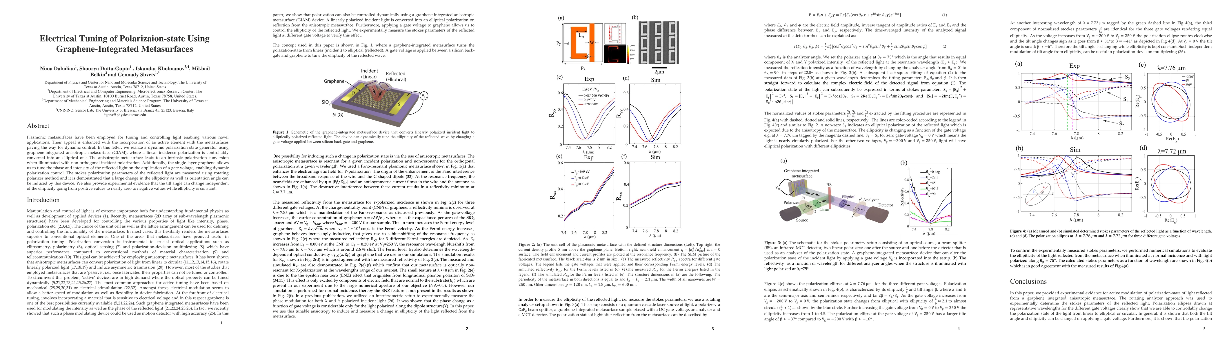 This paper demonstrates a graphene-integrated anisotropic metasurface (GIAM) that dynamically converts linear incident polarization into elliptical polarization. By applying a gate voltage, the phase and intensity of reflected light are tuned, enabling control over polarization state and showing large changes in ellipticity and orientation angle.