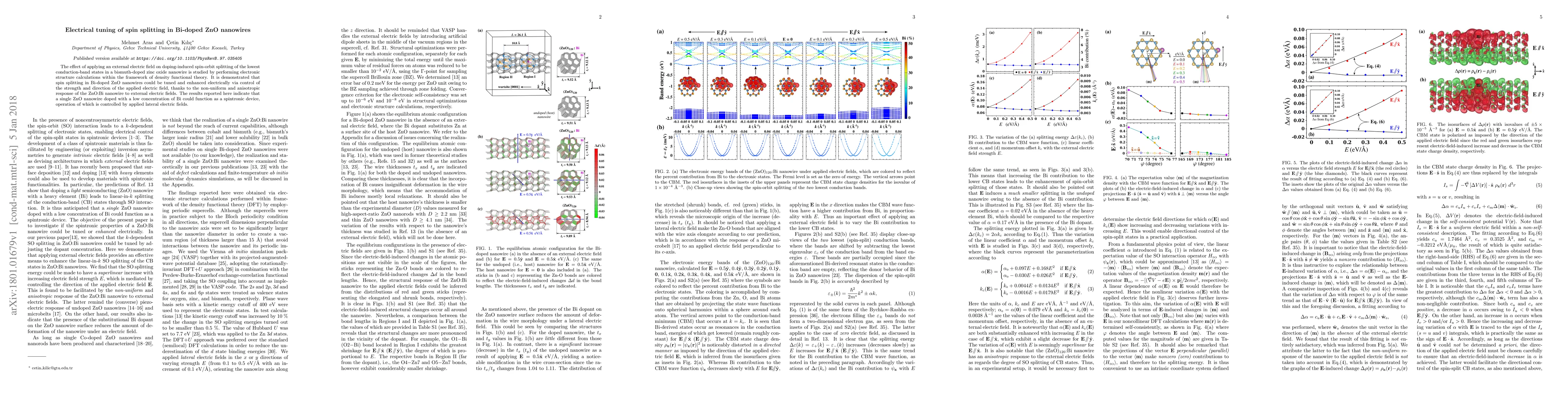 This study demonstrates that spin-orbit splitting in bismuth-doped ZnO nanowires can be electrically tuned and enhanced by applying external electric fields, revealing the potential for these nanowires to function as controllable spintronic devices. Density functional theory calculations show the nonuniform and anisotropic response of ZnO:Bi nanowires to electric fields, enabling operation controlled by lateral electric fields.