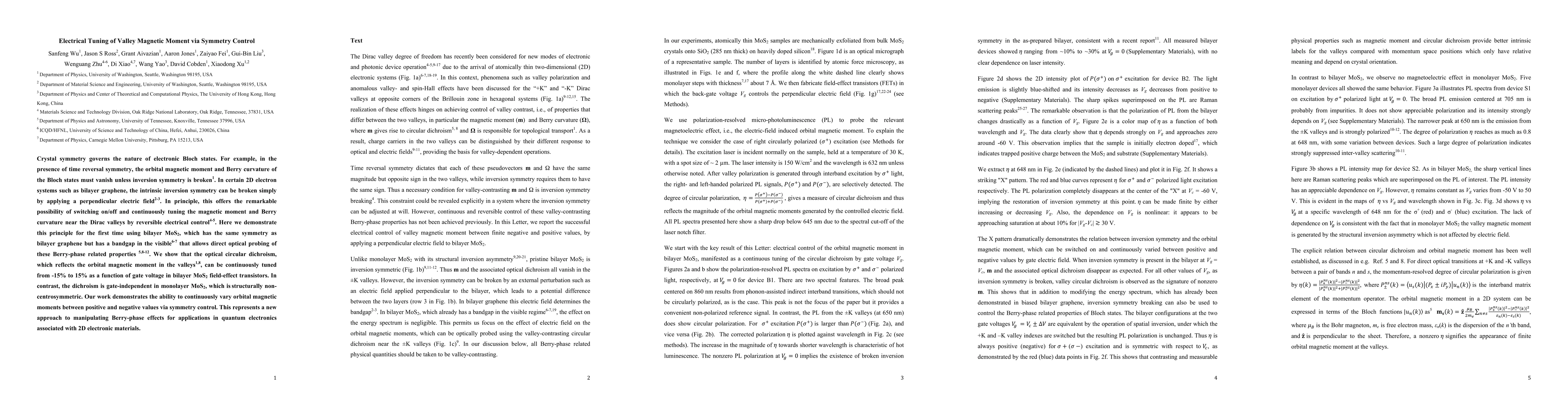 Crystal symmetry governs the nature of electronic Bloch states. For example, in the presence of time reversal symmetry, the orbital magnetic moment and Berry curvature of the Bloch states must vanish unless inversion symmetry is broken. In certain 2D electron systems such as bilayer graphene, the intrinsic inversion symmetry can be broken simply by applying a perpendicular electric field. In principle, this offers the remarkable possibility of switching on/off and continuously tuning the magnetic moment and Berry curvature near the Dirac valleys by reversible electrical control. Here we demonstrate this principle for the first time using bilayer MoS2, which has the same symmetry as bilayer graphene but has a bandgap in the visible that allows direct optical probing of these Berry-phase related properties. We show that the optical circular dichroism, which reflects the orbital magnetic moment in the valleys, can be continuously tuned from -15% to 15% as a function of gate voltage in bilayer MoS2 field-effect transistors. In contrast, the dichroism is gate-independent in monolayer MoS2, which is structurally non-centrosymmetric. Our work demonstrates the ability to continuously vary orbital magnetic moments between positive and negative values via symmetry control. This represents a new approach to manipulating Berry-phase effects for applications in quantum electronics associated with 2D electronic materials.