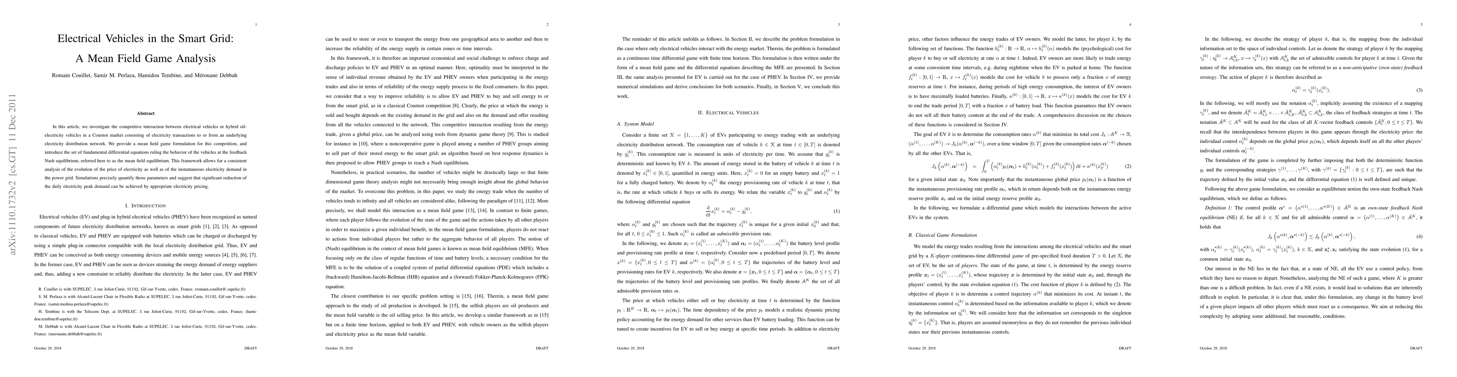 In this article, we investigate the competitive interaction between electrical vehicles or hybrid oil-electricity vehicles in a Cournot market consisting of electricity transactions to or from an underlying electricity distribution network. We provide a mean field game formulation for this competition, and introduce the set of fundamental differential equations ruling the behavior of the vehicles at the feedback Nash equilibrium, referred here to as the mean field equilibrium. This framework allows for a consistent analysis of the evolution of the price of electricity as well as of the instantaneous electricity demand in the power grid. Simulations precisely quantify those parameters and suggest that significant reduction of the daily electricity peak demand can be achieved by appropriate electricity pricing.