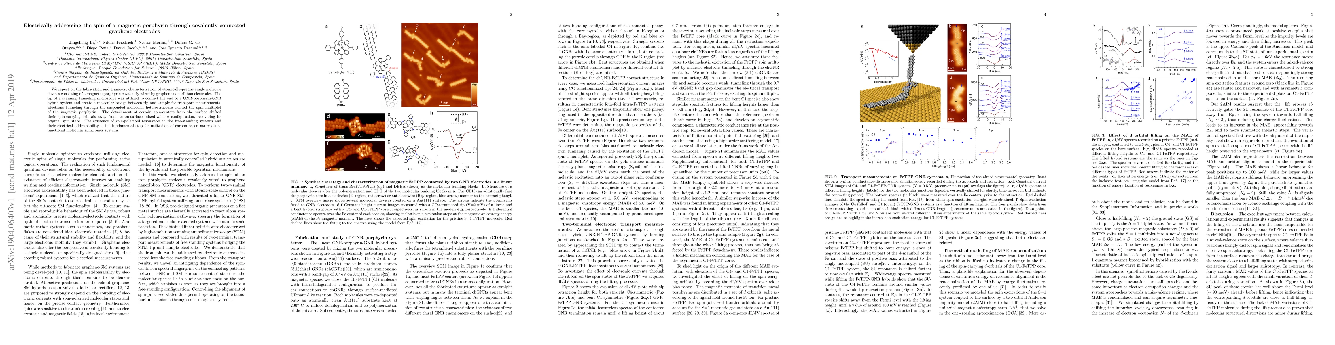 This paper details the fabrication of single molecule devices with magnetic porphyrins connected to graphene nanoribbon electrodes, demonstrating the electrical manipulation of the porphyrin's spin state through tunneling electron interactions. The study highlights the potential of carbon-based materials for molecular spintronics applications.