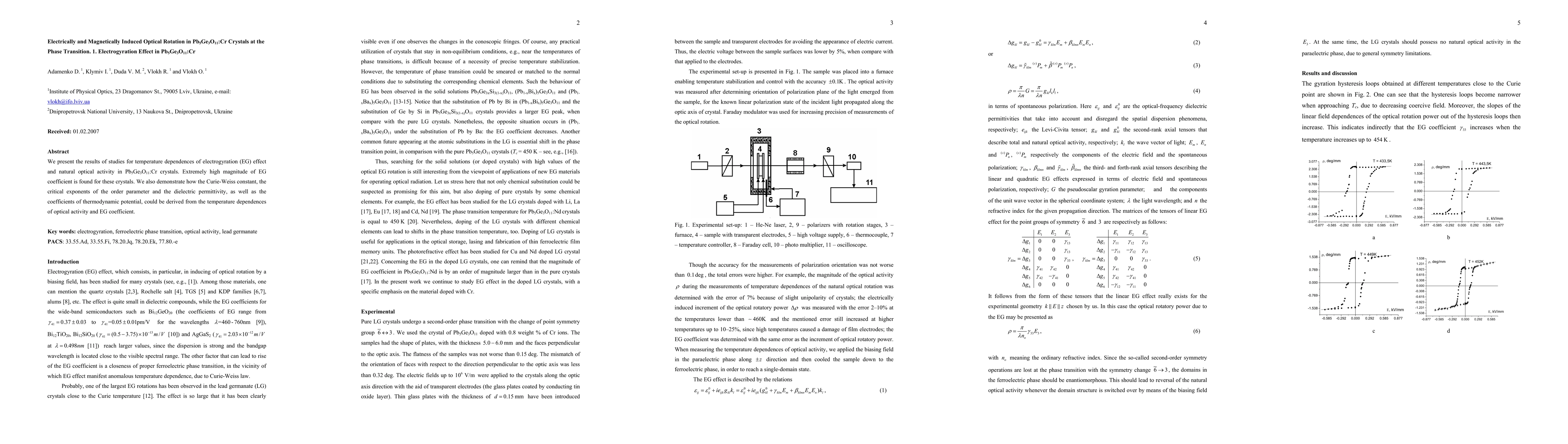 We present the results of studies for temperature dependences of electrogyration (EG) effect and natural optical activity in Pb5Ge3O11:Cr crystals. Extremely high magnitude of EG coefficient is found for these crystals. We also demonstrate how the Curie-Weiss constant, the critical exponents of the order parameter and the dielectric permittivity, as well as the coefficients of thermodynamic potential, could be derived from the temperature dependences of optical activity and EG coefficient.